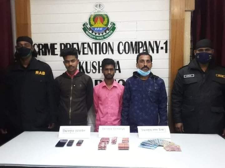 ১। মোঃ তাজ উদ্দিন আহমেদ (৩০) পিতাঃ মোঃ জাবেদ ইকবাল, সাং-কবুরহাট মাদ্রাসাপাড়া, থানা- কুষ্টিয়া সদর ২। মোঃ খোকন মীর (৩৫), পিতাঃ মৃত আজমত মীর, সাং- মিনাপাড়া, থানা- কুষ্টিয়া সদর ৩। আজাদ আলী (৩৮), পিতা- মৃত আদম আলী, সাং- কবুরহাট বিশ^াসপাড়া, থানা- কুষ্টিয়া সদর ৪। মোঃ আলী শেখ (২৩), পিতা- রহিম উদ্দিন শেখ, সাং- খয়ের চারা, থানা- মিরপুর ৫। মোঃ খোকন শেখ (৪৫), পিতাঃ মোঃ সিরাজ শেখ, সাং- খয়ের চারা, থানা- মিরপুর ৬। মোঃ বিজন শেখ (২৪), পিতাঃ মোঃ সাহাবুল শেখ, সাং- খয়ের চারা, থানা- মিরপুর, ৭। মোঃ রুবেল শেখ (২৯), পিতা- মৃত নজরুল ইসলাম, সাং- চিথলিয়া খয়ের চারা, থানা-মিরপুর, সর্ব জেলা-কুষ্টিয়া ’কে গ্রেফতার করা হয়।