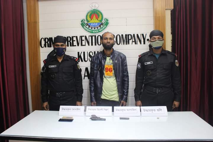 কুষ্টিয়া অদ্য ১৭ ফেব্রুয়ারি ২০২২ ইং তারিখ আনুমানিক রাত ০৮.০৫ ঘটিকার সময় গোপন সংবাদের ভিত্তিতে র্যাব -১২, সিপিসি-১, কুষ্টিয়া ক্যাম্পের একটি বিশেষ অভিযানিক দল কোম্পানি কমান্ডার স্কোয়াড্রন লীডার মোহাম্মদ ইলিয়াস খান এর নেতৃত্বে ‘‘কুষ্টিয়া জেলার সদর থানাধীন চৌড়হাস ফুলতলা এলাকায় জনৈক মোঃ মিজান (৪০), পিতা- মৃত কুতুব উদ্দিন এর অটো গ্যারেজের সামনে একটি অস্ত্র উদ্ধার অভিযান পরিচালনা করে। উক্ত অভিযানে ০১টি বিদেশী পিস্তল, ০১ রাউন্ড গুলি, ০২টি মোবাইল ফোন এবং ০২টি সিম কার্ড সহ এলাকার চিহ্নিত সন্ত্রাসী মোঃ মারুফ হোসেন (৩০), পিতা-মোঃ আফাজ্জেল হোসেন, সাং-বারাদি উত্তরপাড়া, থানা-সদর, জেলা-কুষ্টিয়া’কে গ্রেফতার করা হয়। পরবর্তীতে ধৃত আসামীর বিরুদ্ধে কুষ্টিয়া জেলার কুষ্টিয়া মডেল থানায় অস্ত্র আইনে একটি মামলা দায়ের করা হয়েছে এবং উদ্ধারকৃত আলামত সহ আসামীকে থানায় সোপর্দ করা হয়েছে।