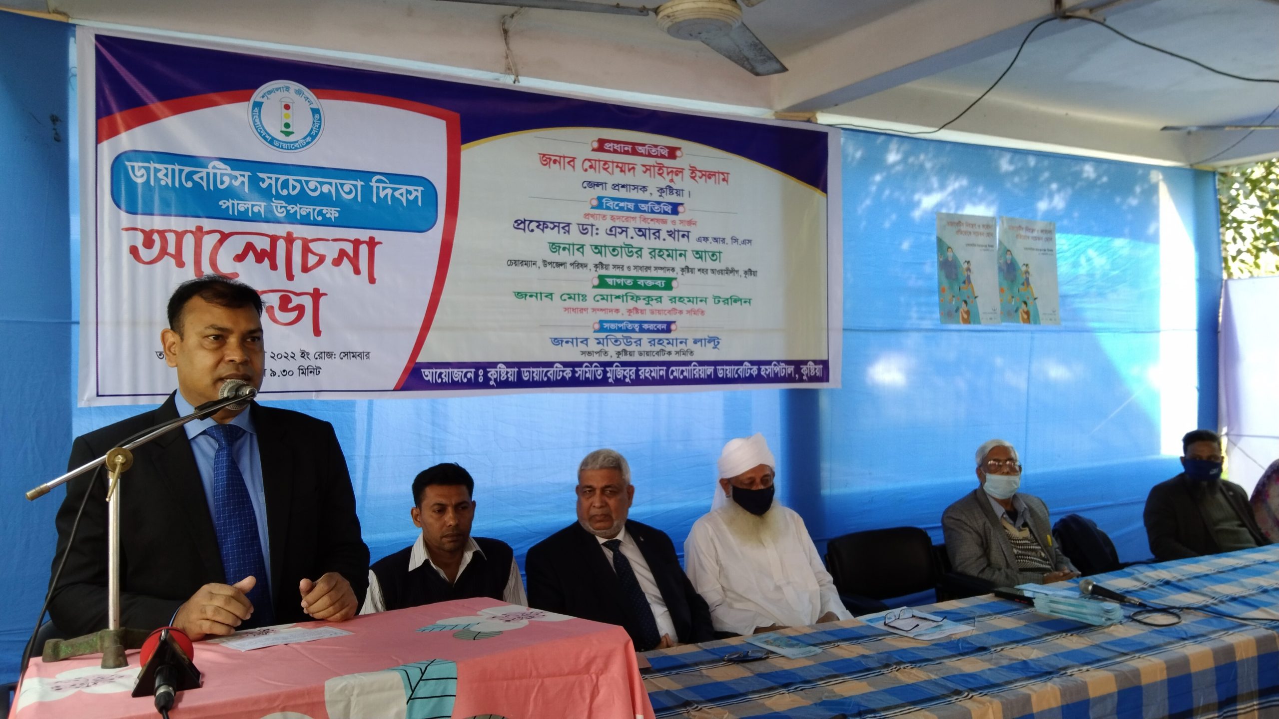 কুষ্টিয়া ডায়াবেটিক সমিতির উদ্যোগে সোমবার ২৮ ফেব্রুয়ারি সকালে ডায়াবেটিস সচেতনতা দিবস পালন করা হয়েছে। আজ সোমবার সকালে কুষ্টিয়া ডায়াবেটিক সমিতি, মজিবর রহমান মেমোরিয়াল ডায়াবেটিক হাসপাতালে এ উপলক্ষে আয়োজিত অনুষ্ঠানে সভাপতিত্ব করেন কুষ্টিয়া ডায়াবেটিক সমিতির সভাপতি মতিউর রহমান লাল্টু। স্বাগত বক্তব্য রাখেন, সাধারন সম্পাদক মোশফিকুর রহমান টরলিন। প্রধান অতিথি ছিলেন কুষ্টিয়ার জেলা প্রশাসক সাইদুল ইসলাম। উপস্থিত ছিলেন হৃদরোগ বিশষেজ্ঞ ডা. এস আর খানসহ বিশিষ্ট জনেরা। অনুষ্ঠানে ডায়াবেটিস রোগ নিয়ন্ত্রণে সচেতনতার ওপর জোর দেওয়া হয়। এছাড়া আক্রান্তরা কিভাবে রোগ নিয়ন্ত্রণে রাখবেন সে বিষয়েও বিশদ আলোচনা করেন বক্তারা।