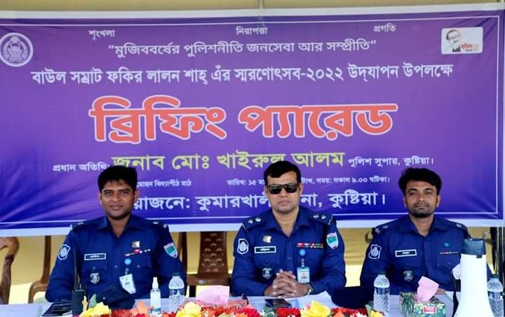 মঙ্গলবার (১৫ মার্চ২০২২) সকাল ৯ টায় বাউল সম্রাট ফকির লালন শাহের স্মরণোৎসব – ২০২২ উপলক্ষে ফোর্স মোতায়েন, ডিউটি কালীন সময়ে আচরণ ও আইন শৃঙ্খলা সংক্রান্তে করনীয় নিয়ে ১৫, ১৬ ও ১৭ মার্চ ২০২২ খ্রিস্টাব্দ (০১, ০২ ও ০৩ চৈত্র ১৪২৮ বঙ্গাব্দ) উদযাপন উপলক্ষ্যে আইন-শৃংখলা কাজে নিয়োজিত অফিসার ও ফোর্সদের উদ্দেশ্যে মোহিনী মোহন আদর্শ ডিগ্রী কলেজ মাঠ, মিলপাড়া চত্ত্বরে ব্রিফিং প্যারেড অনুষ্ঠিত হয়। পুলিশ সুপার কুষ্টিয়া মোঃ খাইরুল আলম প্রধান অতিথি হিসেবে উপস্থিত থেকে পুলিশ সদস্যদের ব্রিফিং প্রদান করেন।