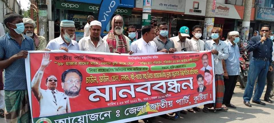 কুষ্টিয়ায় নিত্য প্রয়োজনীয় দ্রব্যের মূল্য বৃদ্ধির প্রতিবাদে জাতীয় পার্টির মানববন্ধন
