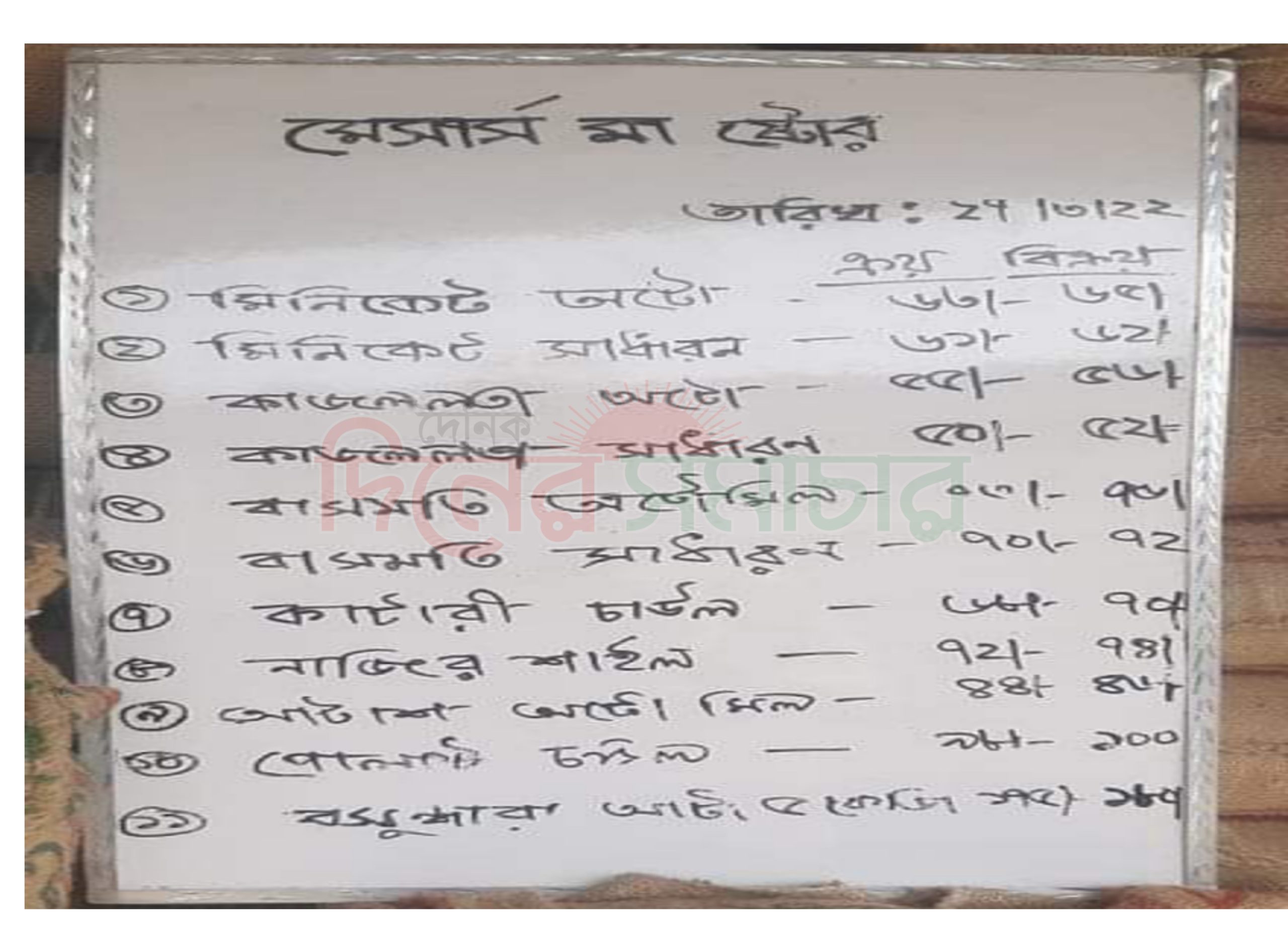পূর্বের নির্ধারিত দামেই কুষ্টিয়ার খুচরা ও পাইকারী বাজারে সব ধরণের চাল বিক্রি হচ্ছে। বাজারের চাল ব্যবসায়ীরা বলছেন, আপাতত চালের দাম কমার কোন সম্ভাবনা তাঁরা দেখছেন না। এদিকে খাদ্যমন্ত্রীকে দেয়া প্রতিশ্রুতির বরখেলাপ করলেও এ নিয়ে স্থানীয় প্রশাসনের দৃশ্যমান কোনো পদক্ষেপ দেখা যাচ্ছে না। চাল কিনতে গিয়ে হাসফাঁস করছেন সাধারণ ক্রেতারা। রোববার (২৭ মার্চ) দুপুরে সরেজমিনে কুষ্টিয়ার বড় বাজার এবং পৌর বাজারে ঘুরে দেখা গেছে, আগের দামেই বাজারে সব ধরণের চাল বিক্রি হচ্ছে। বাজারের চাল ব্যবসায়ীরা যে মূল্য তালিকা টাঙিয়ে রেখেছেন তাতে দেখা যায়, অটো রাইচ মিলে ভাঙানো মিনিকেট চাল খাজানগর মিল গেট থেকে ক্রয় দেখানো হচ্ছে ৬৩ টাকা। আর বিক্রি হচ্ছে প্রতি কেজি ৬৫ টাকা। সাধারণ মিনিকেট চাল ৬১ টাকায় ক্রয় করে বিক্রি করা হচ্ছে ৬২ টাকা, অটো রাইচ মিলে ভাঙানো কাজললতা চাল ৫৫ টাকায় ক্রয় করে বিক্রি হচ্ছে ৫৬ টাকায়, কাজললতা সাধারণ ৫০ টাকায় ক্রয় করে বিক্রি হচ্ছে ৫২ টাকা, অটো রাইচ মিলে ভাঙানো বাসমতি চাল ৭৩ টাকা ক্রয় করে বিক্রি হচ্ছে ৭৬ টাকায়, সাধারণ বাসমতি চাল ৭০ টাকা ক্রয় করে ৭২ টাকা কেজি, কাটারী ভোগ চাল ৬৮ টাকায় কিনে বিক্রি হচ্ছে ৭০ টাকায়, নাজির শাইল চাউল ৭২ টাকায় ক্রয় করে বিক্রি হচ্ছে ৭৪ টাকা, অটো রাইচ মিলে ভাঙানো মোটা আঠাশ চাল ৪৪ টাকা ক্রয় করে বিক্রি করা হচ্ছে ৪৬ টাকায় এবং পোলাও চাল ৯৮ টাকায় ক্রয় করে বিক্রি হচ্ছে ১০০ টাকায়।