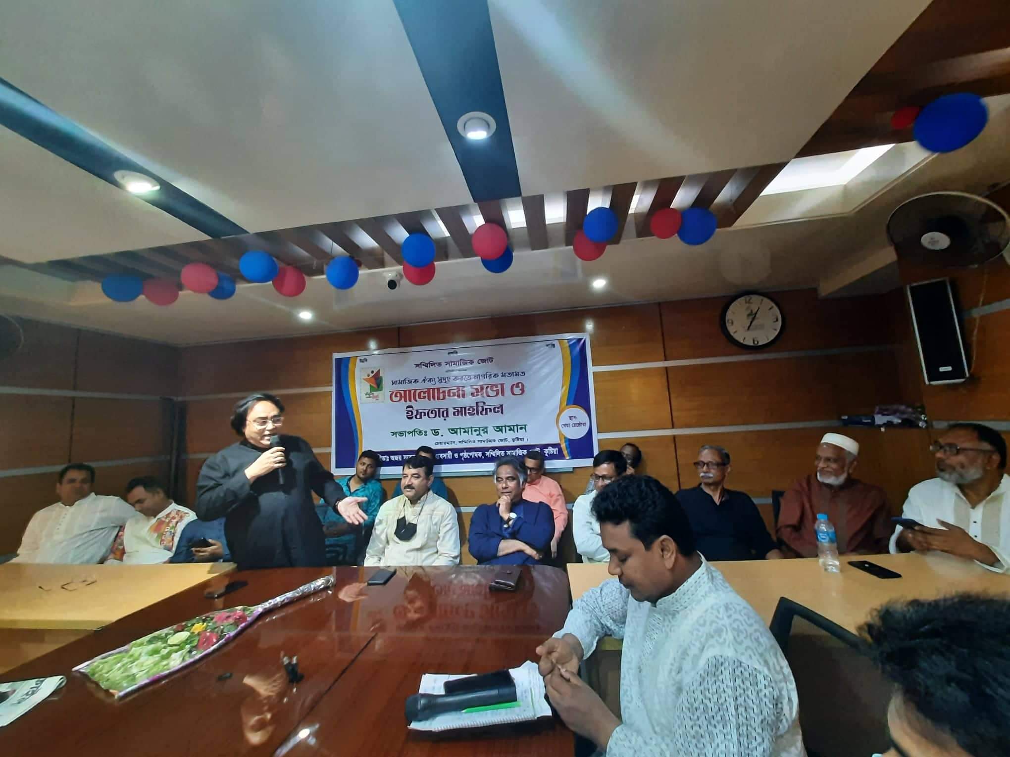 বৃহস্পতিবার ২১ এপ্রিল শহরের খেয়া রেস্তোরায় অনুষ্ঠিত অলোচনা সভা ও ইফতার মাহফিলে সম্মিলিত সামাজিক জোট এর চেয়ারম্যান বিশিষ্ট লেখক ও গবেষক ড. আমানুর আমান এর সভাপতিত্বে প্রধান অতিথির বক্তব্য রাখেন কুষ্টিয়া নাগরিক কমিটির সভাপতি ও কুষ্টিয়া মেডিকেল কলেজের সাবেক অধ্যক্ষ প্রফেমর ডা. এসএম মুসতানজিদ। বিশেষ অতিথির বক্তব্য রাখেন কুষ্টিয়া নাগরিক কমিটির সাধারণ সম্পাদক ও ইসলামী বিশ্ববিদ্যালয়ের সাবেক ট্রেজারার প্রফেসর ড. সেলিম তোহা, ইসলামী বিশ্ববিদ্যালয়ের বাংলা বিভাগের অধ্যাপক ড. সরোয়ার মোর্শেদ রতন, বঙ্গবন্ধু পরিষদ ইসলামী বিশ্ববিদ্যালয় শাখার সাধারণ সম্পাদক ও জাতির পিতা বঙ্গবন্ধু শেখ মুজিবুর রহমান হলের প্রোভোষ্ট ড. মাহবুবুল আরফিন, নাগরিক কমিটির যুগ্ম সম্পাদক সনো ডায়েগষ্টিক সেন্টার ও হাসপাতালের ব্যবস্থাপনা পরিচালক শামসুল ওয়াসে, ইসলামী বিশ্ববিদ্যালয়ের বাংলা বিভাগের অধ্যপক ড. বাকী বিল্লাহ বিকুল, নাগরিক কমিটির নির্বাহী পর্ষদ সদস্য ও দেশ এগ্রোর ব্যবস্থাপনা পরিচালক এম এ খালেক, নাগরিক কমিটির সদস্য ও এরিস্টো কম্পিউটারের স্বত্তাধিকারী রোকনুজ্জামান নান্টু, নদী পরিব্রাজক দল কুষ্টিয়া এবং কুষ্টিয়া ফটোগ্রাফিক সোসাইটির সভাপতি খলিলুর রহমান মজু জেলা শিল্পকলা একাডেমির যুগ্ম সম্পাদক ও সম্মিলিত সাংস্কৃতিক জোটের সাধারণ সম্পাদক শাহীন সরকার।অনুষ্ঠানের সহযোগীতা করেন সম্মিলিত সামাজিক জোটের পৃষ্ঠপোষক বিশিষ্ট ব্যবসায়ী ও সমাজসেবক অজয় সুরেকা।