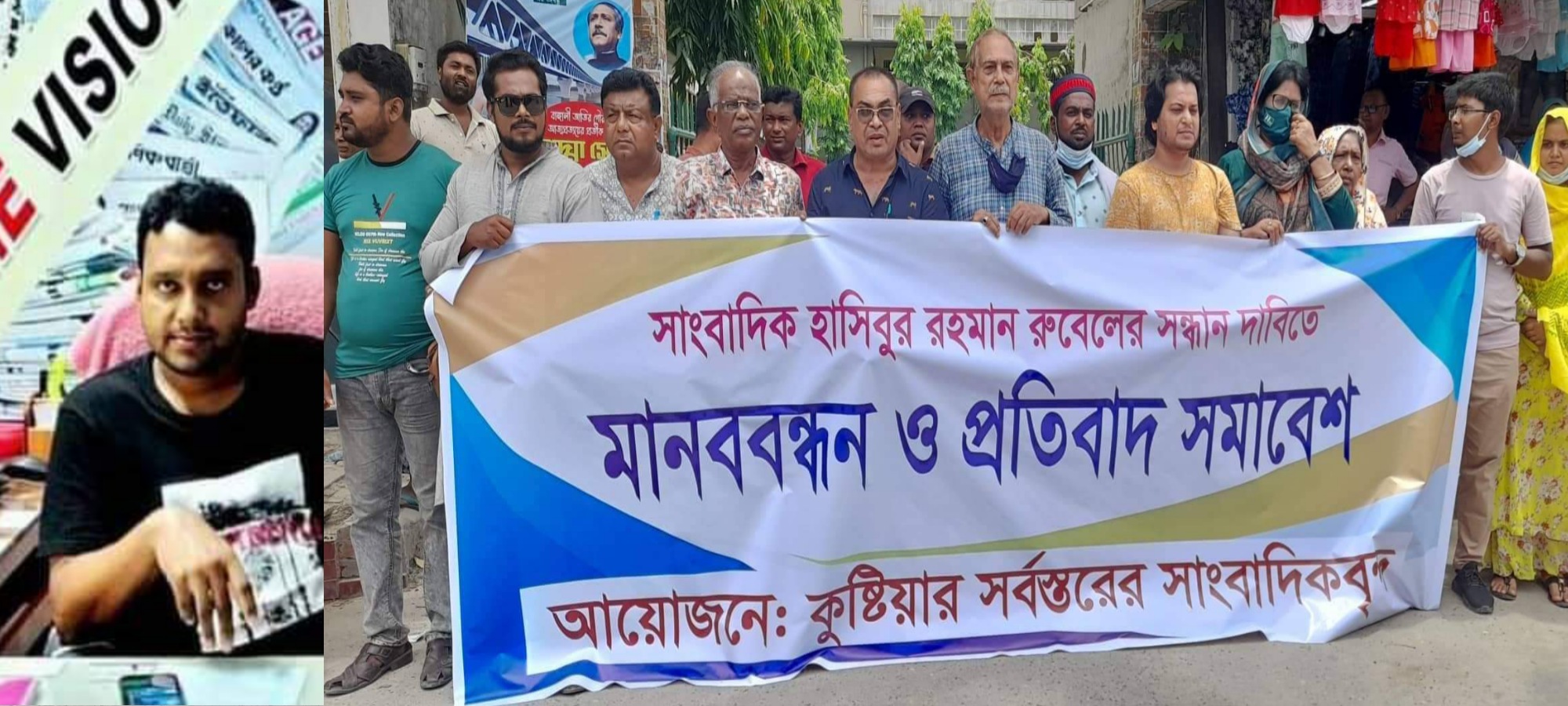 কুষ্টিয়া জেলা রিপোর্টাস ক্লাবের সাধারণ সম্পাদক ও স্থানীয় দৈনিক কুষ্টিয়ার খবর পত্রিকার ভারপ্রাপ্ত সম্পাদক হাসিবুর রহমান রুবেল চারদিন ধরে নিখোঁজ। তাকে ফিরে পাওয়ার দাবিতে কুষ্টিয়ার সর্বস্তরের সাংবাদিকদের আয়োজনে মানববন্ধন ও প্রতিবাদ সমাবেশ অনুষ্ঠিত হয়েছে।