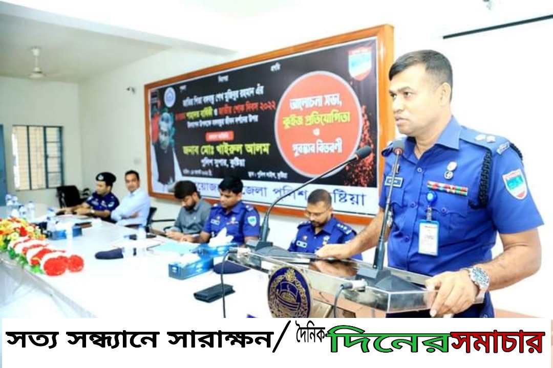 রবিবার (১৪ আগস্ট ২০২২) সকাল ১০ টায় স্বাধীনতার মহান স্থপতি, বাঙ্গালী জাতির অবিসংবাদিত নেতা, সর্বকালের সর্বশ্রেষ্ঠ বাঙ্গালী জাতির পিতা বঙ্গবন্ধু শেখ মুজিবুর রহমান এঁর ৪৭ তম শাহাদত বার্ষিকী উপলক্ষে জেলা পুলিশ, কুষ্টিয়ার আয়োজনে পুলিশ লাইন্সের সম্মেলন কক্ষে বঙ্গবন্ধুর জীবন দর্শনের উপর কুষ্টিয়া জেলা পুলিশ সদস্যদের মাঝে কুইজ প্রতিযোগিতা, আলোচনা সভা ও পুরস্কার বিতরণী অনুষ্ঠান অনুষ্ঠিত হয়। উক্ত অনুষ্ঠানে প্রধান অতিথি হিসেবে উপস্থিত ছিলেন পুলিশ সুপার কুষ্টিয়া মোঃ খাইরুল আলম। বঙ্গবন্ধুর জীবন দর্শনের উপর আলোচনা সভায় প্রধান অতিথি পুলিশ সুপার কুষ্টিয়া মোঃ খাইরুল আলম সহ জেলা পুলিশের সকল পদমর্যাদার পুলিশ সদস্যগণ জাতির পিতা বঙ্গবন্ধু শেখ মুজিবুর রহমান এঁর জীবন দর্শনের উপর বক্তব্য রাখেন। কুইজ প্রতিযোগিতায় গ্রুপ ভিত্তিক অর্থাৎ “ক” গ্রুপে – এসআই হতে পুলিশ পরিদর্শক “খ” গ্রুপে – কনস্টেবল হতে এএসআই পদমর্যাদার পুলিশ সদস্য, এবং “গ”-গ্রুপ সিভিল স্টাফ ও আউটসোর্সিং সদস্যসহ সর্বমোট ০৩ টি ক্যাটাগরিতে ভিন্ন ভিন্ন প্রশ্নপত্রে সর্বমোট ১২০ জন কুষ্টিয়া জেলা পুলিশের সদস্যগণ কুইজ প্রতিযোগিতায় অংশ গ্রহণ করেন এবং এর মধ্যে ০৯ জনকে বিজয়ী ঘোষণা করা হয়। প্রধান অতিথি মহোদয় উক্ত কুইজ প্রতিযোগিতায় বিজয়ীদের মাঝে পুরস্কার হিসেবে জাতির পিতা বঙ্গবন্ধু শেখ মুজিবুর রহমান এঁর জীবনীর উপর লেখা বই তুলে দেন।