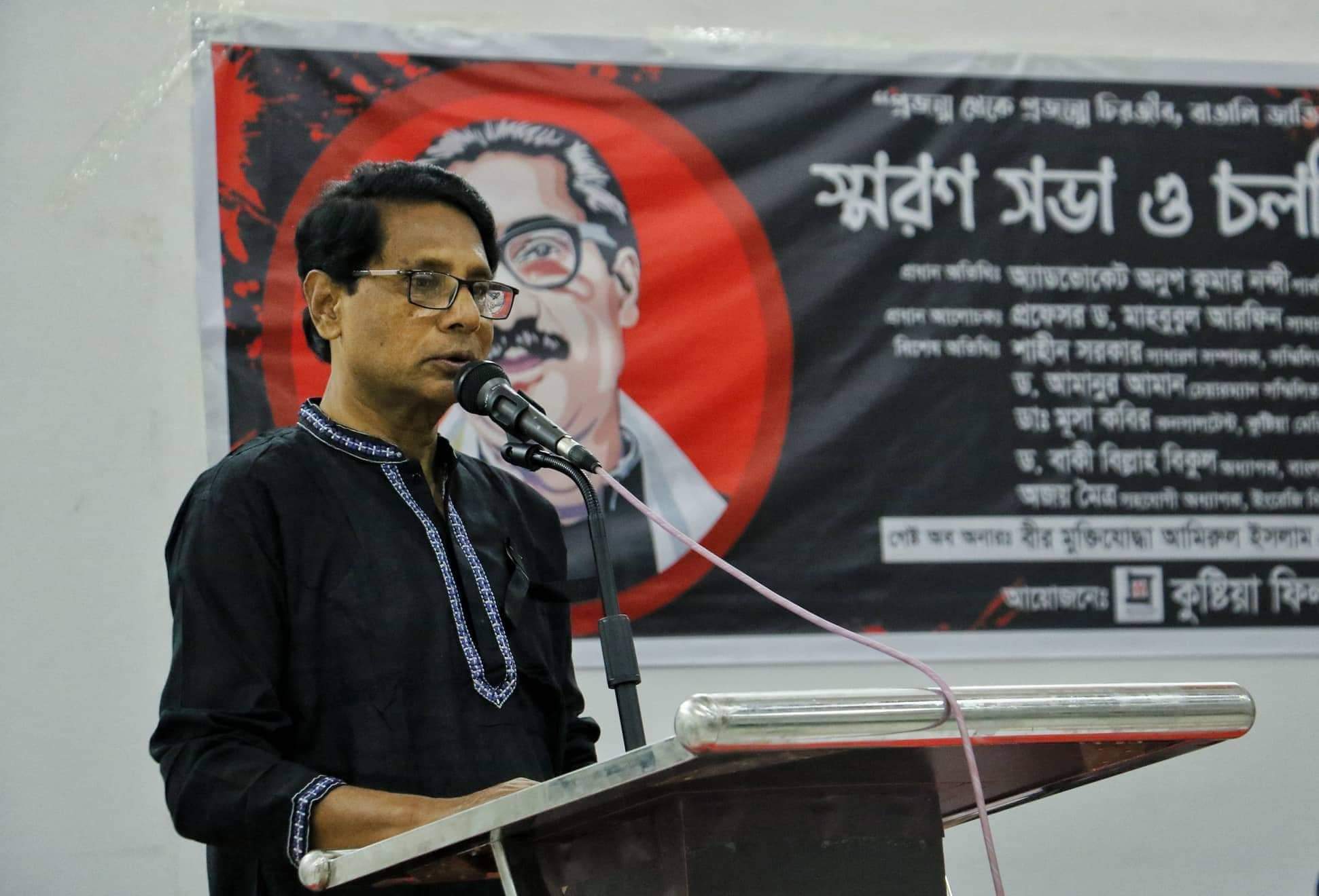 প্রধান অতিথি হিসেবে উপস্থিত ছিলেন কুষ্টিয়া জজ কোর্টের বিজ্ঞ পাবলিক প্রসিকিউটর, জেলা ক্রীড়া সংস্থা কুষ্টিয়ার সাধারণ সম্পাদক, উদীচী কুষ্টিয়া জেলা শাখার সভাপতি ও কুষ্টিয়া জেলা আওয়ামীলীগের অন্যতম সহসভাপতি বীর মুক্তিযোদ্ধা অ্যাড. অনুপ কুমার নন্দী। আলোচনা সভায় সংগঠনটির প্রধান উপদেষ্টা অনুপ কুমার নন্দী তার বক্তব্যে বলেন ” চলচ্চিত্রের মাধ্যমে বঙ্গবন্ধুর আদর্শ ও ত্যাগকে কুষ্টিয়া ফিল্ম সোসাইটি প্রজন্ম থেকে প্রজন্মে ছড়িয়ে দিচ্ছে, তাদের এই অনন্য উদ্যোগকে আমি সাধুবাদ জানাই। দ্বিজাতিতত্ত্বের ভিত্তিতে ভারত পাকিস্তান ভাগ অপ্রত্যাশিত ছিল। বাঙালির জন্য এ ভাগটি ছিলো অভিষাপ স্বরুপ, বঙ্গবন্ধু তা বুঝতে পেরে জাতির মুক্তির সংগ্রাম করে স্বাধীনতা অর্জনের মাধ্যমে এই অভিশপ্ত জাতির ভাগ্য খুলে দেন। তাই তার প্রতি প্রতিটি বাঙালির কৃতজ্ঞ থাকা উচিৎ।