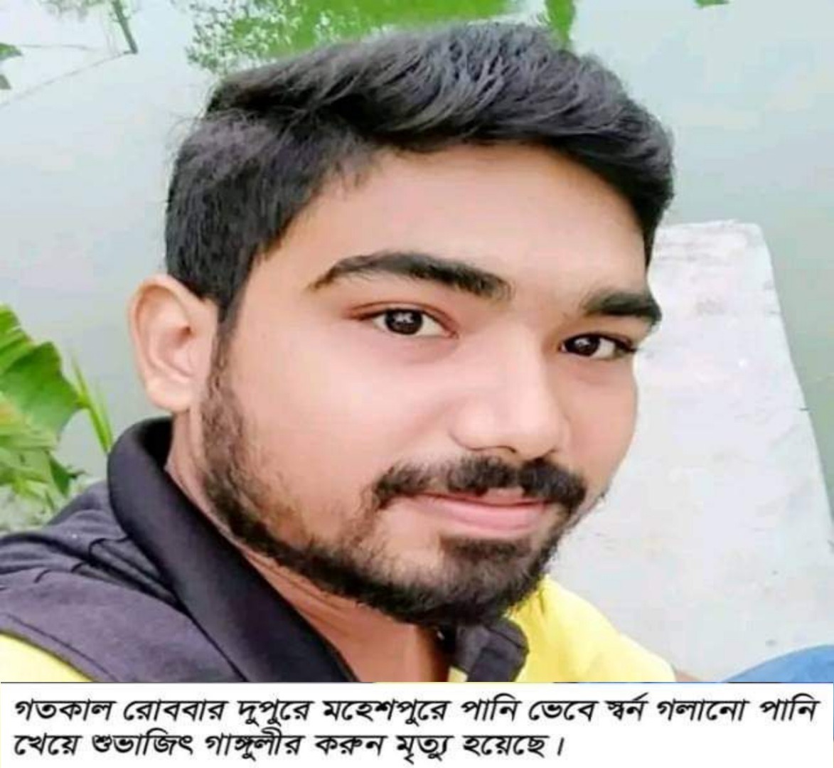 টেবিলের পাশে রাখা বোতলের পানি ভেবে স্বর্ন গলানো পানি (পটাশিয়ামের জল) খেয়ে অকালেই এই সুন্দর পৃথীবি ছেড়ে চিরোদিনের জন্য বিদায় নিলেন শুভজিৎ গাঙ্গুলী (৩০)। এঘটনাটি ঘটেছে রোববার সন্ধ্যা রাতে ঝিনাইদহের মহেশপুর শহরের বাজারের নিজ দোকানে। শুভজিৎ গাঙ্গুলী ১পুত্র সন্তানের জনক ও পৌরসভার ৫নং ওয়ার্ডের বারুইপাড়া এলাকার সন্তোষ গাঙ্গুলীর ছেলে।