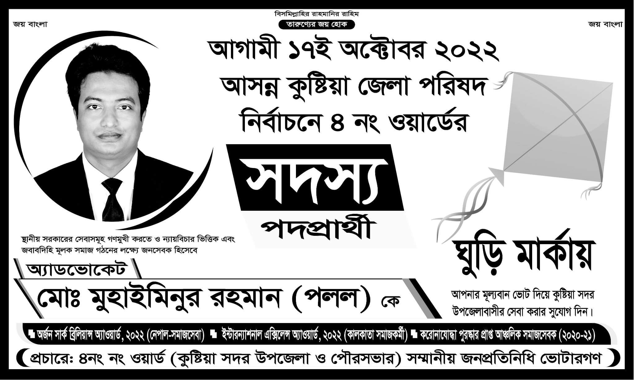 অ্যাডভোকেট মোঃ মুহাইমিনুর রহমান পলল। ঘুড়ি মার্কায় ৪ নং ওয়ার্ড কুষ্টিয়া সদর সদস্য প্রার্থী।