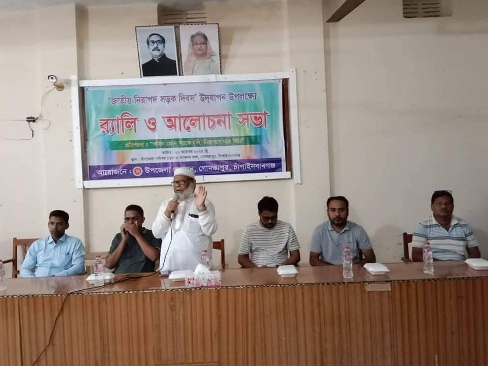 আইন মেনে সড়কে চলি নিরাপদে ঘরে ফিরি এই শ্লোগান কে সামনে রেখে জাতীয় নিরাপদ সড়ক দিবস উদযাপন করা হয়। শনিবার সকালে উপজেলা প্রশাসন আয়োজনে উপজেলা সভাকক্ষে আলোচনা সভা অনুষ্ঠিত হয়। অনুষ্ঠানে প্রধান অতিথি ছিলেন উপজেলা চেয়ারম্যান হুমায়ুন রেজা। বক্তব্য রাখেন উপজেলা প্রকৌশলী সুলতানুল ইমাম, উপজেলা সমবায় অফিসার নাদিম উদ্দিন, উপজেলা পল্লী উন্নয়ন অফিসার রাইসুল ইসলাম, উপজেলা প্রকল্প বাস্তবায়ন অফিসার হাবিবুর রহমান, গোমস্তাপুর উপজেলা প্রেসক্লাব সভাপতি নুর মোহাম্মদ প্রমুখ।