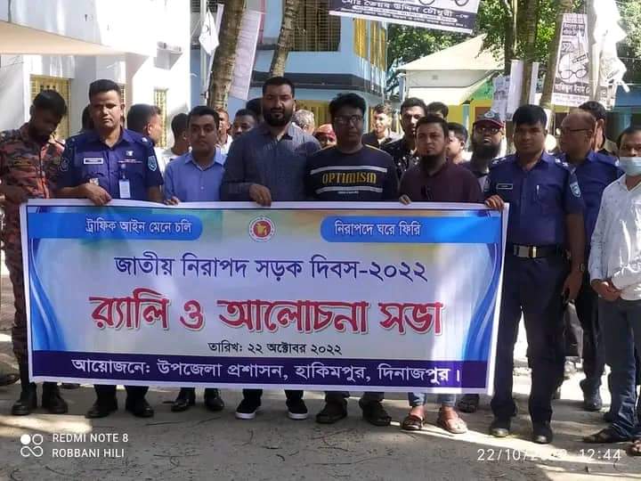 ট্রাফিক আইন মেনে চলি নিরাপদে ঘরে ফিরি’ এই প্রতিপাদ্যকে সামনে রেখে দিনাজপুরের হাকিমপুর হিলিতে র‌্যালি ও আলোচনা সভার মধ্যে দিয়ে জাতীয় নিরাপদ সড়ক দিবস পালিত হয়েছে।