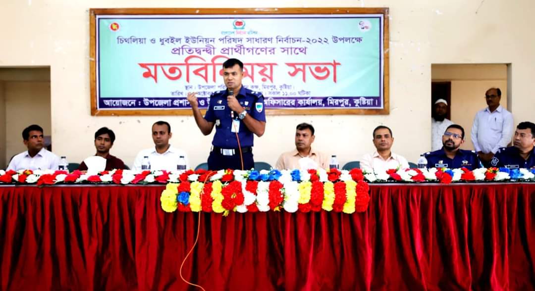 পুলিশ সুপার কুষ্টিয়া মোঃ খাইরুল আলম তার বক্তব্যে উপস্থিত চিথলিয়া ও ধুবইল ইউনিয়নের প্রতিদ্বন্দ্বী প্রার্থীদের ইউনিয়ন পরিষদ নির্বাচন – ২০২২ সংক্রান্ত সকল আচরণ বিধি মনোযোগ সহকারে পড়া এবং তা প্রতিপালন করার ব্যাপারে গুরুত্ব আরোপ করেন। তিনি আরো বলেন, এবারের ইউনিয়ন পরিষদ নির্বাচন – ২০২২ অবাধ, সুষ্ঠু, নিরপেক্ষ, শান্তিপূর্ণ ও বিশ্বাসযোগ্য করার জন্য ভোট কেন্দ্রের নিরাপত্তা সহ নির্বাচনী এলাকায় শান্তি-শৃঙ্খলা বজায় রাখার জন্য পর্যাপ্ত সংখ্যাক পুলিশ অফিসার ও ফোর্স মোতায়েন করা হবে। এছাড়াও ইউনিয়ন পরিষদ সাধারণ নির্বাচন সংশ্লিষ্ট সকল সরঞ্জাম ও দলিল দস্তা বেজ, নির্বাচনী কাজে ব্যবহৃত অফিস/কার্যালয়ের নিরাপত্তা বিধান করা, স্থানীয় জননিরাপত্তা, ভোটকেন্দ্রে ভোটারের শৃঙ্খলা নিশ্চিত করা, স্থানীয় এলাকার আইন শৃঙ্খলা ঠিক রাখা সহ প্রয়োজনীয় সকল ধরনের নিরাপত্তা ও পুলিশি সেবা নিশ্চিত করা হবে।