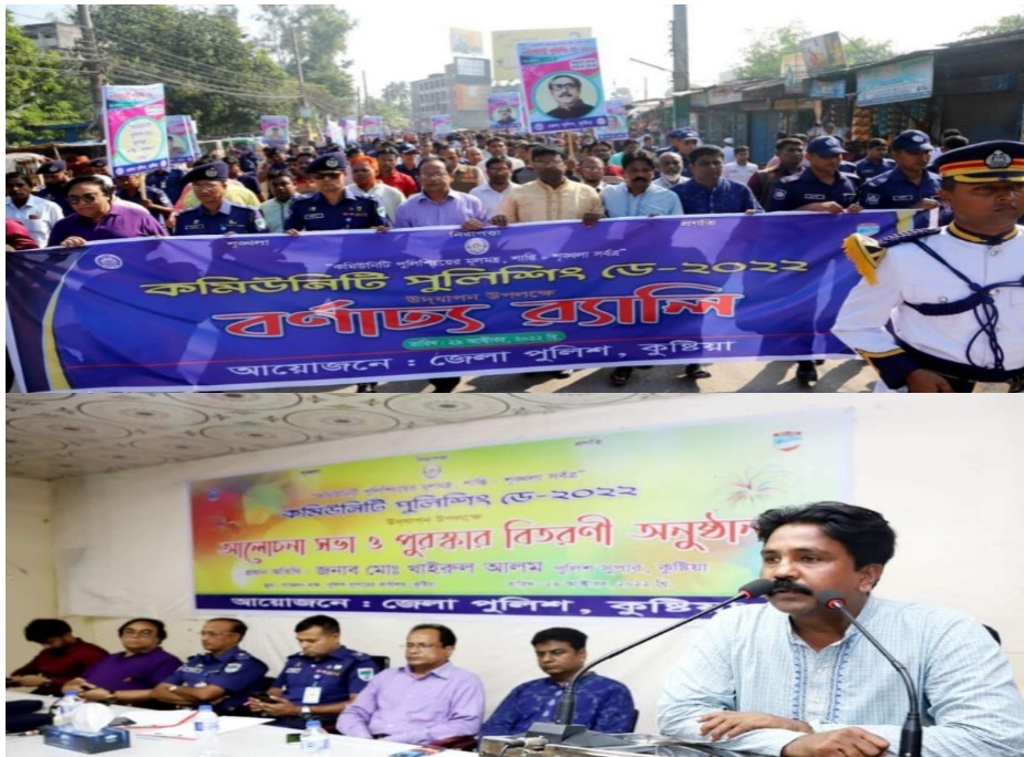 শনিবার ( ২৯ অক্টোবর, ২০২২) সকাল ৯টায় কুষ্টিয়া জেলা পুলিশের আয়োজনে কুষ্টিয়া পুলিশ লাইন্সের সামনে থেকে ফেস্টুন উড়িয়ে একটি বর্নাঢ্য র‌্যালী বের হয়ে শহর প্রদক্ষিণ করে আবার পুলিশ লাইন্সে এসে শেষ হয়। কুষ্টিয়া পুলিশ লাইন্সের সম্মেলন কক্ষে কমিউনিটি পুলিশিং ডে ২০২২ উদযাপন উপলক্ষে প্রথমে কেক কাটা হয় এবং পরবর্তীতে আলোচনা সভা ও পুরস্কার বিতরণ কার্যক্রম করা হয়। উক্ত অনুষ্ঠানে প্রধান অতিথির বক্তব্যে পুলিশ সুপার কুষ্টিয়া মোঃ খাইরুল আলম বলেন, সময়ের চাহিদায় কমিউনিটি পুলিশিং এখন সাধারণ মানুষের কাঙ্ক্ষিত উপাদান হিসেবে পরিণত হয়েছে। কমিউনিটি পুলিশিং এর মাধ্যমে জনমুখী পুলিশিং কার্যকর করার ক্ষেত্রে পুলিশ সর্বতভাবে কাজ করে যাচ্ছে। সমাজে অপরাধ দমন ও স্থিতিশীলতা বজায় রাখতে পুলিশ সবসময় বিশেষ ভূমিকা রেখে চলছে। আমাদের দেশে যে সামাজিক ঐক্য ও ধর্মীয় সম্প্রীতি বিদ্যমান আছে; এটি আমরা দৃঢ়ভাবে বজায় রাখবো এবং কমিউনিটি পুলিশিং এর মাধ্যমে জনসেবা আরো বৃদ্ধি করা হবে। কমিউনিটি পুলিশিংয়ের কারণে পুলিশ ও জনতার যে মেলবন্ধন সৃষ্টি হবে তা দেশে অপরাধ দমনে গুরুত্বপূর্ণ টুলস হিসেবে কাজ করবে; জনগন ও পুলিশের বন্ধনই পারে দেশের আইনশৃঙ্খলা পরিস্থিতি স্বাভাবিক ও টেকসই রাখতে। কুষ্টিয়ায় কমিউনিটি পুলিশিং জোরদারের মাধ্যমে মানুষের আস্থা অর্জন করে পুলিশ হবে জনতার বন্ধু।