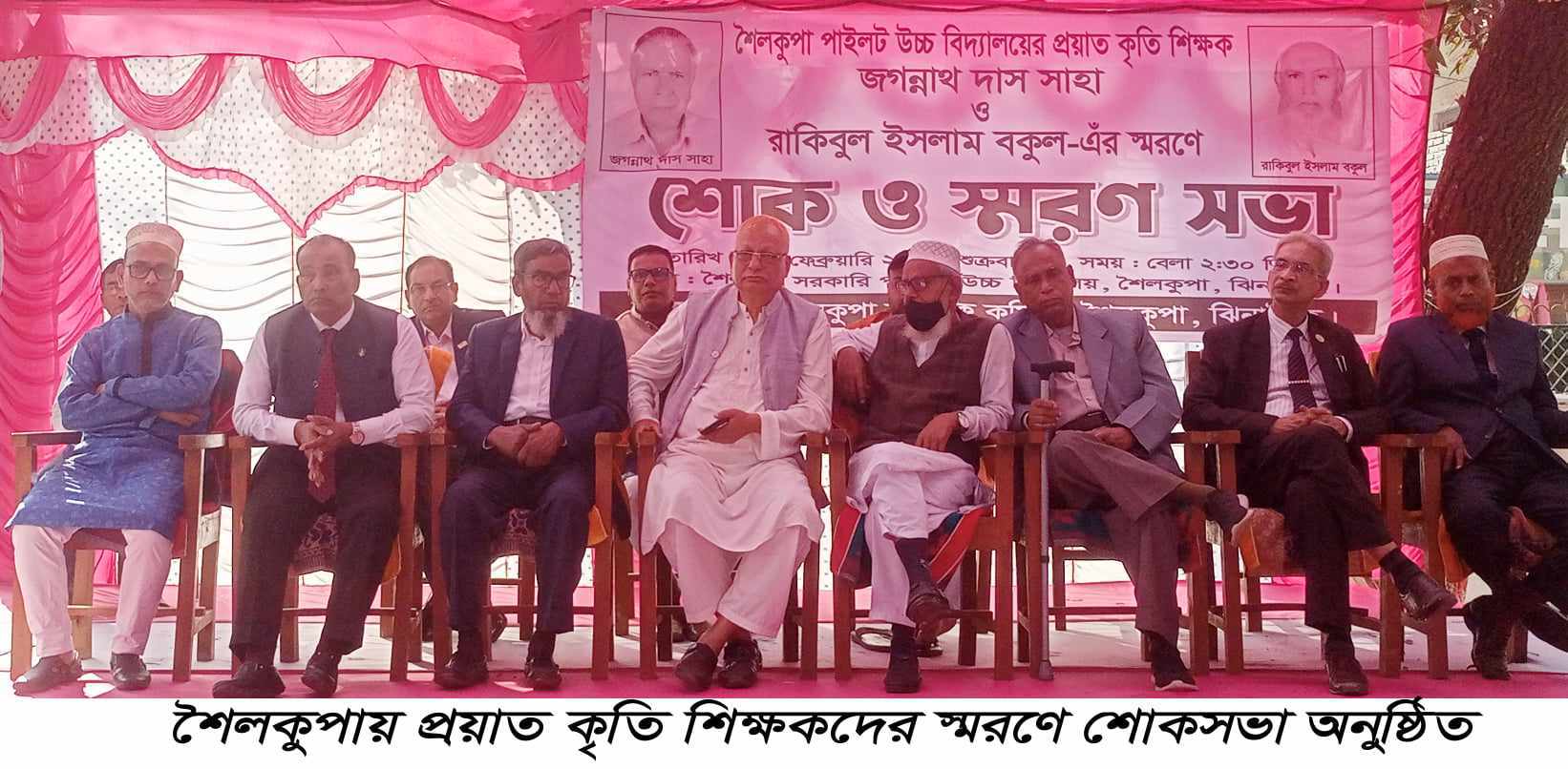 ঝিনাইদহের শৈলকুপায় প্রয়াত কৃতি দুই শিক্ষকের স্মরণে শোক ও স্মরণ সভা অনুষ্ঠিত হয়েছে। শুক্রবার (১৬ ফেব্রুয়ারি) বিকাল ৩টার দিকে শৈলকুপা নাগরিক কমিটির আয়োজনে প্রয়াত কৃতি শিক্ষক জগন্নাথ দাস সাহা ও রাকিবুল ইসলাম বকুল-এঁর স্মরণে শোক সভা অনুষ্ঠিত হয়। শৈলকুপা পাইলট উচ্চ বিদ্যালয় প্রাঙ্গণে উদীচি উপজেলার শাখার সাধারণ সম্পাদক আলমগীর অরণ্যের সঞ্চালনায় ও শৈলকুপা নাগরিক কমিটির আহবায়ক অ্যাডভোকেট ইসমাইল হোসেনের সভাপতিত্বে সংক্ষিপ্ত আলোচনায় বক্তব্য রাখেন সাবেক সহকারী প্রধান শিক্ষক এস এম কোবাদ, উপজেলা পরিষদের ভাইস চেয়ারম্যান জাহিদুন্নবী কালু, নাগরিক কমিটির সদস্য সচিব ফিরোজ খান নুন, গণতন্ত্র পার্টির প্রেসিডিয়াম সদস্য ও নাগরিক কমিটির উপদেষ্টা জেড এ ওয়াহেদ, প্লানিং কমিশনের উপ-প্রধান শামছুর রহমান, পাবলিক হল ও লাইব্রেরির সাধারণ সম্পাদক স্বপন বাগচি, অধ্যাপক ডা. লক্ষণ চন্দ্র কুন্ডু, ইঞ্জিনিয়ার জাহিদুল ইসলাম, শৈলকুপা সরকারি পাইলট উচ্চ বিদ্যালয়ের ভারপ্রাপ্ত প্রধান শিক্ষক মহিদুল ইসলাম, ডা. রেজাউল ইসলাম, উপজেলা আওয়ামী লীগের যুগ্নসাধারণ সম্পাদক রেজাউল ইসলাম রাজু প্রমুখ।