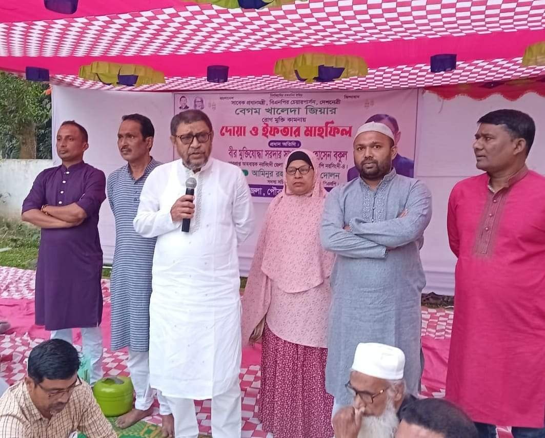নরসিংদীর মনোহরদীতে সাবেক প্রধানমন্ত্রী,বিএনপির চেয়ারপার্সন,দেশনেত্রী বেগম খালেদা জিয়ার রোগমুক্তি কামনায় দোয়া ও ইফতার মাহফিল অনুুষ্ঠিত হয়েছে।আজ বৃহস্পতিবার (২১ শে মার্চ ২০২৪ খ্রি.)উক্ত ইফতার মাহফিল আয়োজন করা হয়েছে মনোহরদী উপজেলার চালাকচর ইউনিয়নের হাফিজপুর তামাককান্দা ঈদগাহ্ মাঠে।এ সময় মনোহরদী উপজেলা বিএনপি,পৌর বিএনপি ও অংগসংগঠনের আয়োজনে সাবেক প্রধানমন্ত্রী,বিএনপির চেয়ারপার্সন,দেশনেত্রী বেগম খালেদা জিয়ার রোগমুক্তি কামনায় দোয়া ও আলোচনা মাহফিল অনুুষ্ঠিত হয়েছে।উক্ত ইফতার ও দোয়া মাহফিলে মনোহরদী উপজেলা বিএনপির সদস্য সচিব,আমিনুর রহমান সরকার দোলন এর সঞ্চালনায় প্রধান অতিথি হিসেবে উপস্থিত ছিলেন,নরসিংদী জেলা বিএনপির ভারপ্রাপ্ত আহবায়ক,মনোহরদী উপজেলা বিএনপির আহবায়ক,সাবেক সংসদ সদস্য,বীরমুক্তিযোদ্ধা সরদার সাখাওয়াত হোসেন বকুল।প্রধান অতিথির বক্তব্যে তিনি বলেন,এই অবৈধ সরকার ভারতের মদদে রাষ্ট্রযন্ত্রকে ব্যবহার করে ক্ষমতায় ঠিকে রয়েছে,আপনারা ধৈর্য্যধরুন সেই দিন আর বেশী দূরে নয়,যেদিন অবৈধ সরকারের মসনদ ভেঙ্গে চুরমার হয়ে যাবে,এছাড়া তিনি উপস্থিত সকলকে ভারতীয় পণ্য বর্জনের আহ্বান জানান।