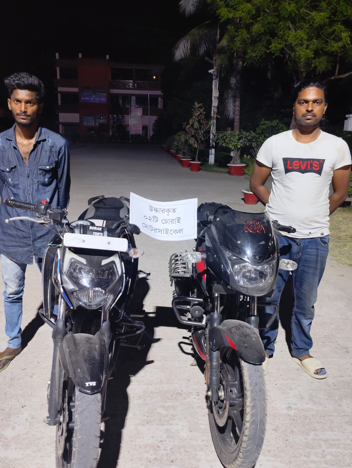পুলিশ সুত্রে জানা যায়, কুষ্টিয়া জেলা গোয়েন্দা (ডিবি) পুলিশের অফিসার ইনচার্জ (ওসি) মোঃ মাহফুজুল হক চৌধুরী পিপিএম এর নেতৃত্বে এসআই সনজীব ঘোষ সহ সঙ্গীয় অফিসার ফোর্সসহ গোপন সংবাদের ভিত্তিতে ইবি থানাধীন পাটিকাবাড়ী ইউনিয়নের ফকিরাবাদ এলাকায় চোরাই মোটরসাইকেল ক্রয় বিক্রয় কালে চোর চক্রের সক্রিয় সদস্য মোঃ সবুর হাসান(৩৩) ও মোঃ আরিফুল ইসলাম ডিজে (২৬) কে আটক করে। এসময় তাদের কাছ থেকে চোরাইকৃত ০১টি লাল-কালো রংয়ের 150cc Pulsar ও ০১টি সাদা-কালো রংয়ের রেজিষ্ট্রেশন বিহীন Apache RTR 160cc 4v মোটর সাইকেল সহ হাতেনাতে আটক করা হয়। এসময় চোর সক্রের আরও দুইজন আসামি কৌশলে দৌড়ে পালিয়ে যায়। আসামিদের বিরুদ্ধে ইতিপূর্বেও মোটরসাইকেল চুরির মামলা রয়েছে।