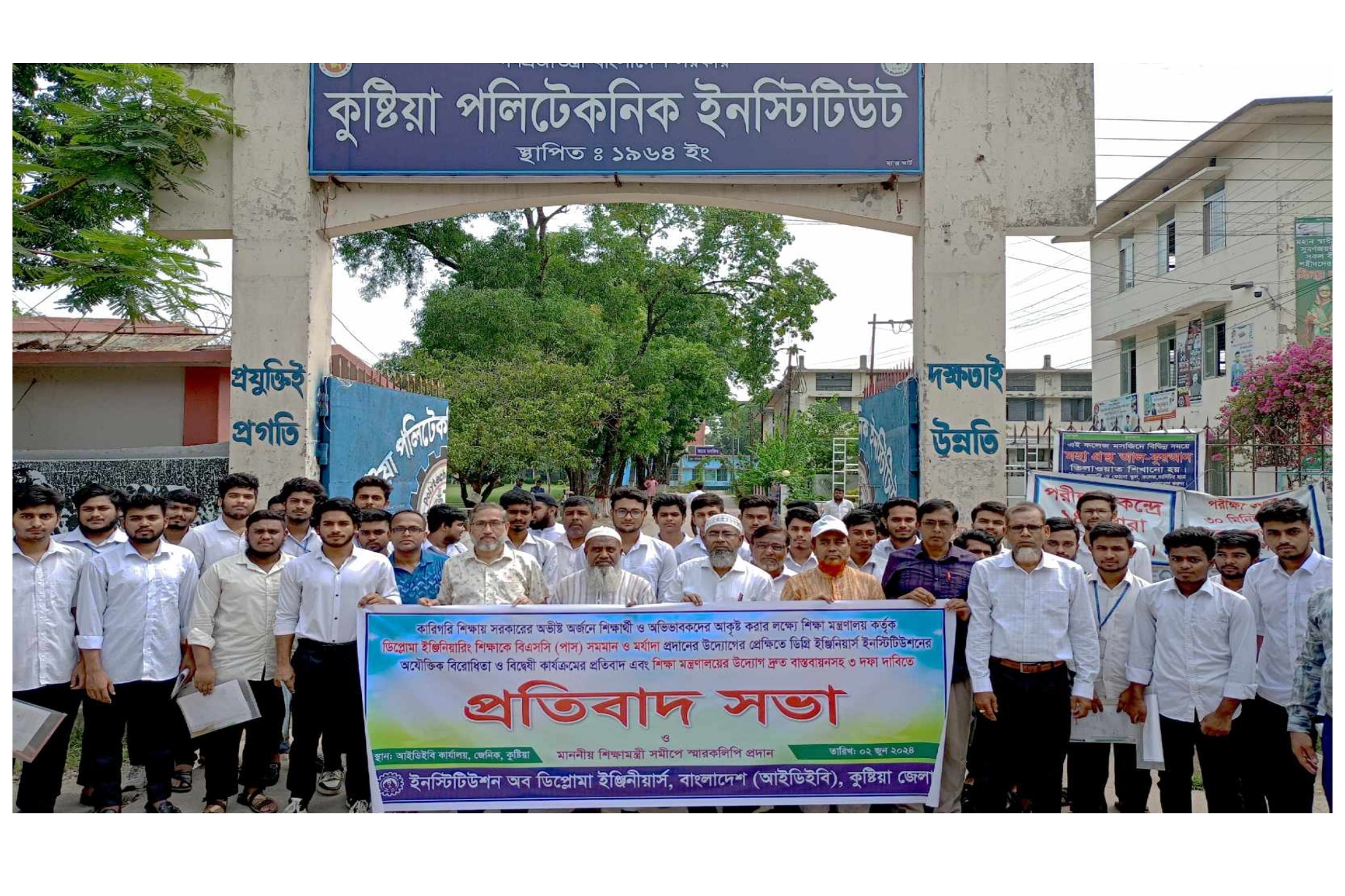 রোববার (২ জুন) সকালে শহরের কাঁটায় খানা মোড় এলাকায় পলিটেকনিক ইনস্টিটিউট চত্বরে ইনস্টটিউিশন অব ডিপ্লমা ইঞ্জিনিয়ার্স, বাংলাদশ (আইডিইবি) কুষ্টিয়া শাখার উদ্যোগে মানববন্ধন ও স্মারকলিপি প্রদান করা হয়।