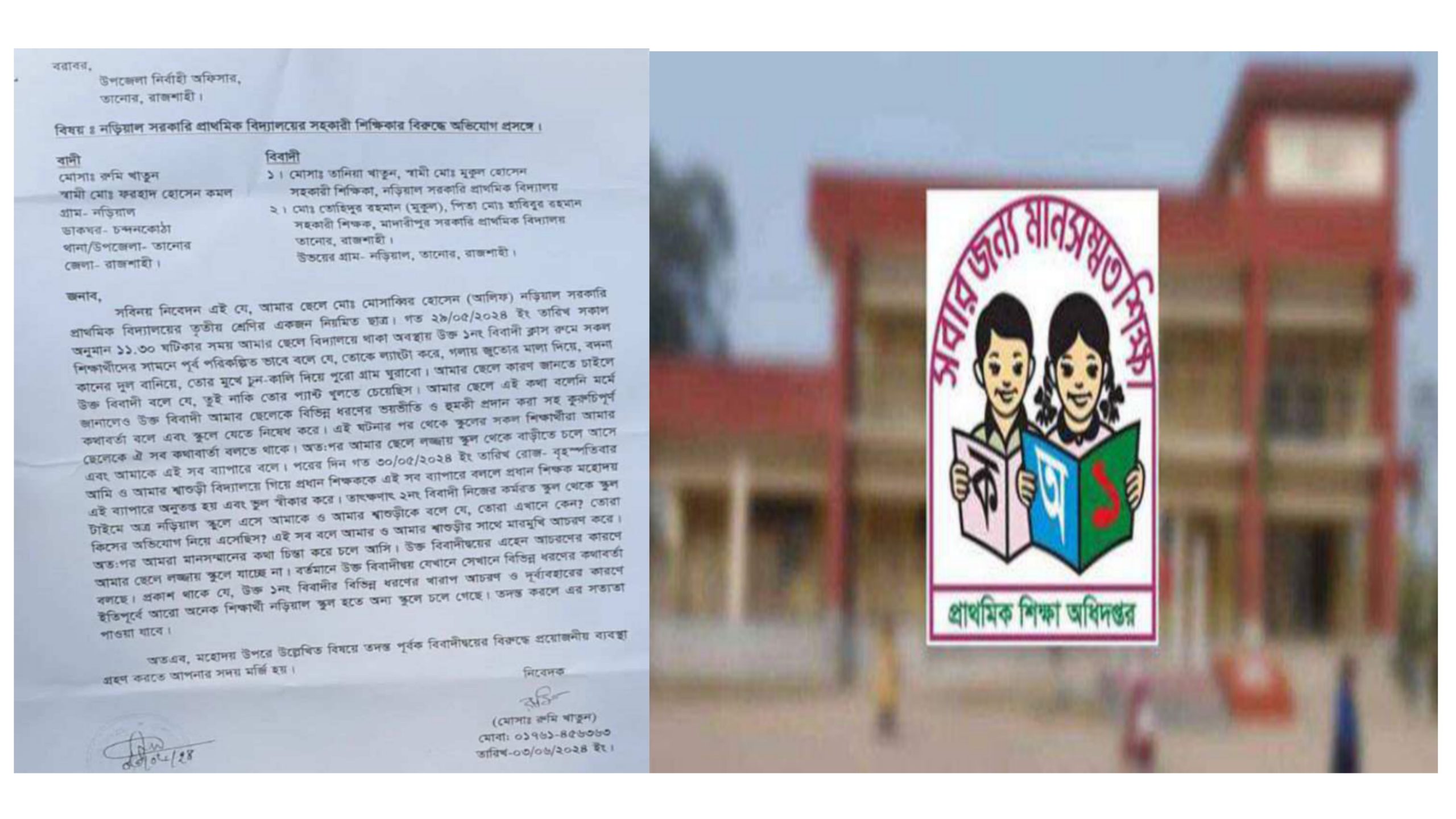 অভিযোগে বলা হয়েছে, নড়িয়াল সরকারি প্রাথমিক বিদ্যাল য়ের তৃতীয় শ্রেণির নিয়মিত শিক্ষার্থী মোসাব্বির হোসেন (আ লিফ)। গত ২৯ মে বুধবার সকালে বিদ্যালয়ে যান।
