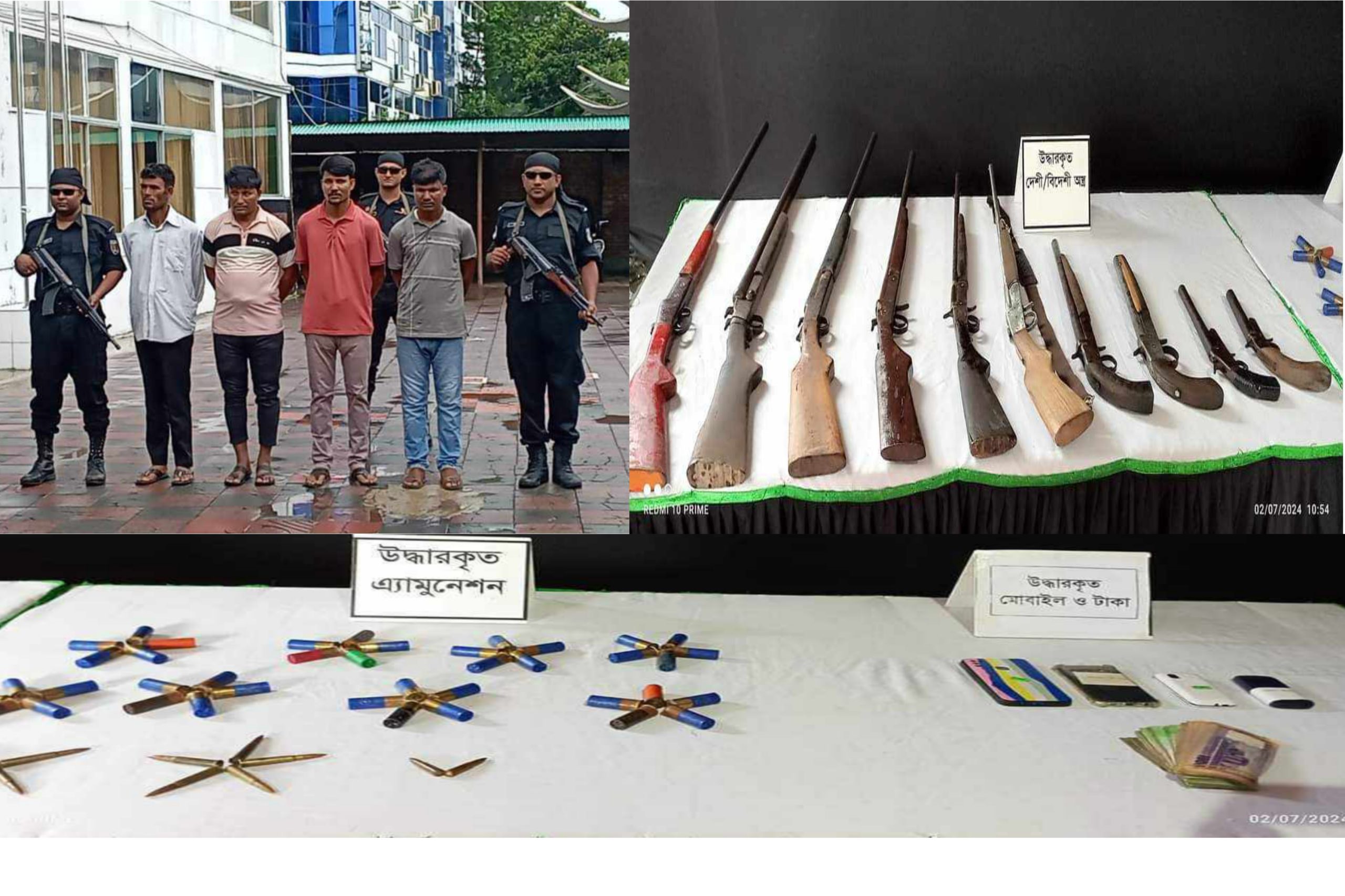 উদ্ধার করা হয়েছে ১০টি আগ্নেয়াস্ত্র, ১২ বোর ৪০ রাউন্ড, ৭.৬২ মিঃ মিঃ ১০ রাউন্ড এবং ৭.৬৫ মিঃ মিঃ ২ রাউন্ড। প্রাথমিক জিজ্ঞাসাবাদে গ্রেফতারকৃতরা ডাকাতি, চিংড়ি ঘের দখল ও বিভিন্ন সন্ত্রাসী কর্মকান্ডের সাথে তাদের সংশ্লিষ্টতার বিষয়ে তথ্য প্রদান করেছে বলে জানিয়েছেন সংশ্লিষ্ট কর্তৃপক্ষ।