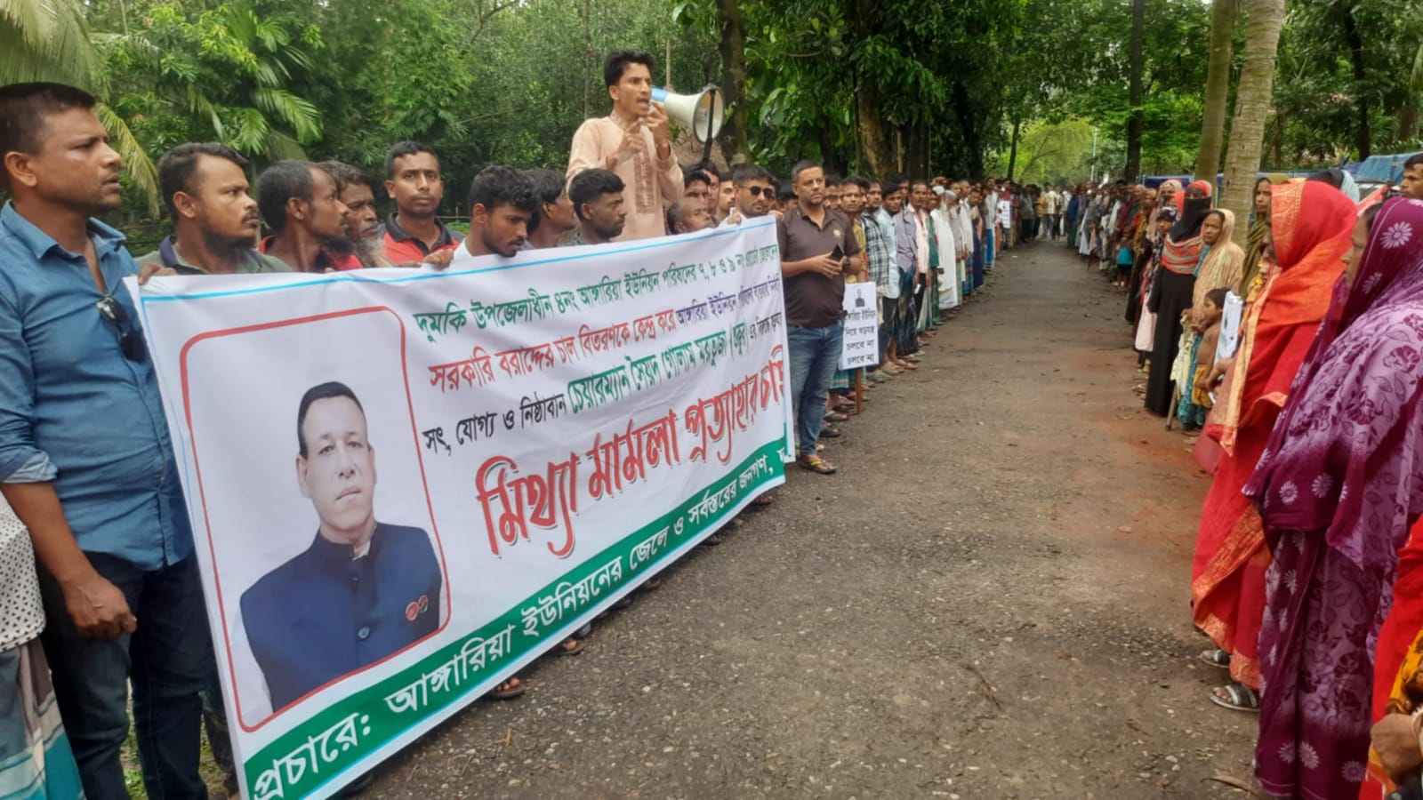 বুধবার বেলা সাড়ে ১০টায় উপজেলার আঙ্গারিয়া ইউনিয়ন পরিষদ ও চেয়ারম্যানের বাড়ির সামনে আঙ্গারিয়া ইউনিয়নবাসির ব্যানারে ৫শতাধিক নারী-পুরুষ  মানববন্ধন ও বিক্ষোভ কর্মসূচিতে অংশ নেন। বিক্ষোভপূর্ব সমাবেশে আঙ্গারিয়া ইউনিয়নের বাসিন্দা ও উপজেলা যুবলীগের সহ সম্পাদক সুজন জোমাদ্দার, জেদ্দা আওয়ামী লীগের সদস্য সেলিম শিকদার, আঙ্গারিয়া ইউনিয়ন আলীগের সাবেক সাংগঠনিক সম্পাদক আবু জাফর জোমাদ্দার, উপজেলা ছাত্রলীগের সাবেক সাধারণ সম্পাদক সোহেল শরীফসহ আওয়ামীলীগে অঙ্গ সহযোগী সংগঠনের একাধিক নেতাকর্মীরা বক্তৃতা করেন। বক্তারা জেলেদের মাঝে সরকারি চাল বিতরণকে কেন্দ্র করে আঙ্গারিয়া ইউনিয়ন পরিষদ চেয়ারম্যান গোলাম মর্তুজা শুক্কুর’র বিরুদ্ধে মিথ্যে মামলা প্রত্যাহারের জোর দাবি জানান পাশাপাশি একটি কুচক্রী মহল সামান্য একটা বিষয়কে চুনকালি মেখে নোংরা রাজনীতির পরিচয় দিচ্ছেন বলে বক্তারা বলেন।