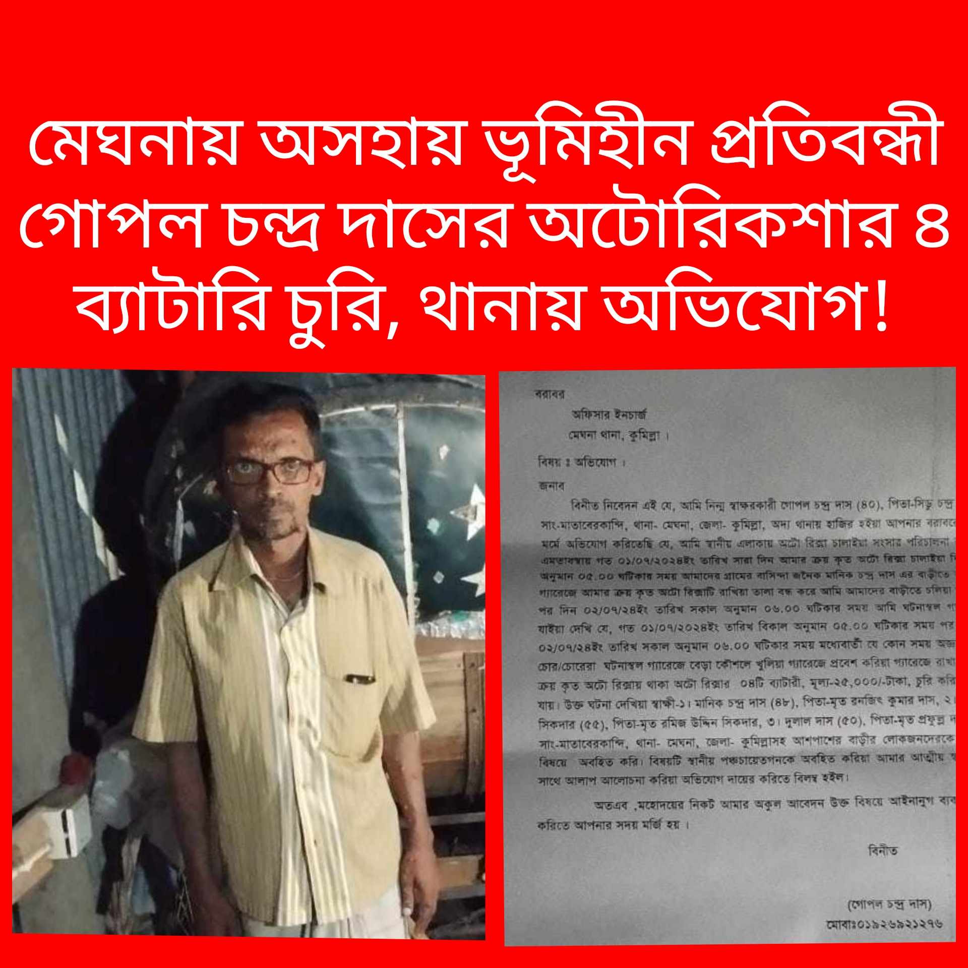 মেঘনায় অসহায় ভূমিহীন প্রতিবন্ধী গোপল চন্দ্র দাসের অটোরিকশার ৪ ব্যাটারি চুরি, থানায় অভিযোগ!