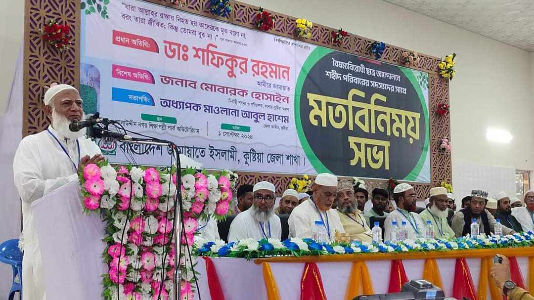 রোববার (০১ সেপ্টেম্বর) সকাল ৯টার দিকে কুমারখালী উপজেলার আলাউদ্দিন পার্ক অডিটোরিয়ামে কুষ্টিয়া জেলা জামায়াতের আয়োজনে বৈষম্যবিরোধী ছাত্র আন্দোলনে শহীদ পরিবারের সদস্যদের সঙ্গে মতবিনিময় সভায় প্রধান অতিথির বক্তব্যে তিনি এ কথা বলেন। জামায়াতের আমির ডাঃ শফিকুর রহমান বলেন, কেমন শাসন করলেন? বললেন বাংলাদেশ উন্নয়নের রোল মডেল, বেহেশতি বাগান। তাহলে সাড়ে ১৫ বছরের মাথায় এভাবে আপনাদের দেশ ছেড়ে যেতে হলো কেন।