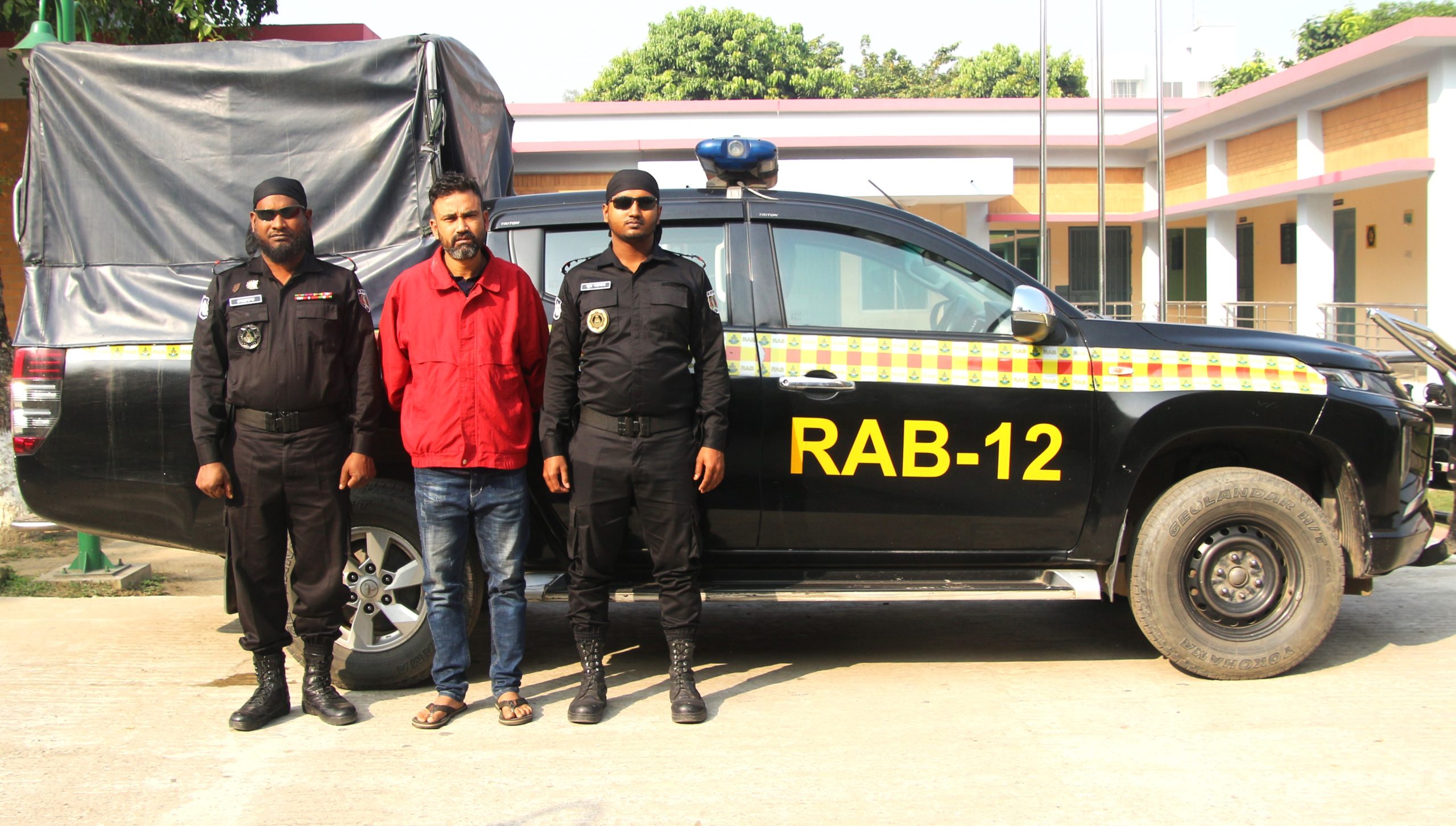 র‌্যাব-১২ এবং র‌্যাব-১ এর যৌথ অভিযানে হত্যা মামলার অন্যতম পলাতক আসামি ঢাকা হতে গ্রেফতার