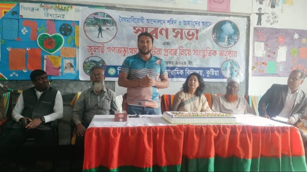 কুষ্টিয়ার মুসলিম হাই স্কুলে এক স্মরণ সভা অনুষ্ঠিত হয়েছে। বৈষম্যবিরোধী আন্দোলনে শহিদ ও আহতদের স্মরনে এ স্মরন সভার আয়োজন করা হয়। জুলাই গনঅভ্যুত্থানের ঘটনা প্রবাহ নিয়ে মঙ্গলবার (২৬ নভেম্বর) সন্ধা ৭টার দিকে সাংস্কৃতিক অনুষ্ঠানের মাধ্যমে আলোচনা করা হয়। এতে প্রধান অতিথি হিসেবে উপস্থিত ছিলেন, কুষ্টিয়া শহর যুবদলের আহবায়ক মোস্তাফিজুর রহমান সুমন। অনুষ্ঠানে সভাপতিত্ব করেন মুসলিম হাইস্কুলের প্রধান শিক্ষিকা নিলিমা আক্তার। বিশেষ অতিথি ছিলেন, অভিভাবক সদস্য আনোয়ার হোসেন, শিক্ষক প্রতিনিধি রফিকুল ইসলাম, গুলশানারা, সবনম, রিংকু, মাসুদ প্রমূখ। এসময় শহর যুবদলের আহবায়ক মোস্তাফিজুর রহমান সুমন বলেন, আজকে আমরা নতুন বাংলাদেশে স্বাধীন ভাবে চলতে পারছি সবই ছাত্র জনতার জন্য। তাদেরকে মনে রাখতে হবে। দীর্ঘ ১৬বছর দেশে কোন স্বাধীনতা ছিলো না। মানুষকে জিম্মি করে রেখেছিলো আওয়ামীলীগের দোসররা। তারা কিন্তু এখনো ঘাপটি মেরে আছে। আমাদের সজাগ থাকতে হবে, দেশে আর কোন জুলুম অত্যাচারকে ঠাই দেয়া যাবে না। কোন শিক্ষা প্রতিষ্ঠানেও স্বাধীনতা ছিলো না। শিক্ষকরা কিছু বললে চাকরি চলে যাবে বলে আওয়ামী লীগের দোসররা হুমকি দিতো। তিনি আরো বলেন, সারাদেশে দুই হাজারের মতো মানুষকে খুন করার সেই ফ্যাসিবাদী দোসরদের বিন্দুমাত্র অনুশোচনা নেই। প্রায় অর্ধ লাখ মানুষকে রক্তাক্ত করা, শত শত ভাই-বোনকে পৃথিবীর আলোর মুখ দেখতে না দেওয়া, শত-শত বীর যোদ্ধা রয়েছে যারা আর নিজের পায়ে ভর দিয়ে দাঁড়াতে পারবে না, শত শত বীর যোদ্ধা আছে তারা আর কোনো দিন নিজের বাবা-মা ও স্ত্রীকে নিজের হাত দিয়ে জড়িয়ে ধরতে পারবে না- সেই নরপিশাচদের থেকে দুরে থাকতে হবে। পরে সকল শহিদদের আত্মার মাগফিরাত কামনা ও আহতদের সুস্থতা কামনা করে দোয়া অনুষ্ঠিত হয়।