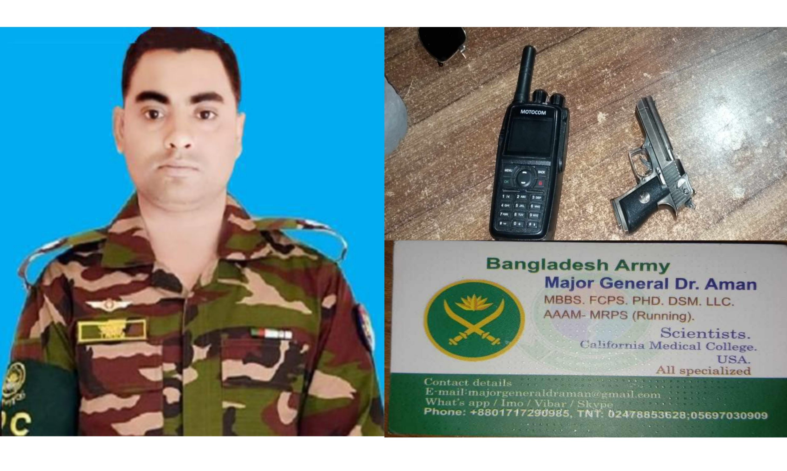 আটককৃত ব্যক্তির নাম খন্দকার বায়েজিদ আমান। তিনি নওগাঁ জেলার রাণীনগর উপজেলার বাহাদুরপুর গ্রামের মৃত এনামুল হকের ছেলে। তিনি বিভিন্ন স্থানে বাংলাদেশ সেনাবাহিনীর মেজর জেনারেল ডা. আমান হিসেবে পরিচয় দেন। তার বিরুদ্ধে প্রতারণা ও চাঁদাবাজির একাধিক অভিযোগ রয়েছে।