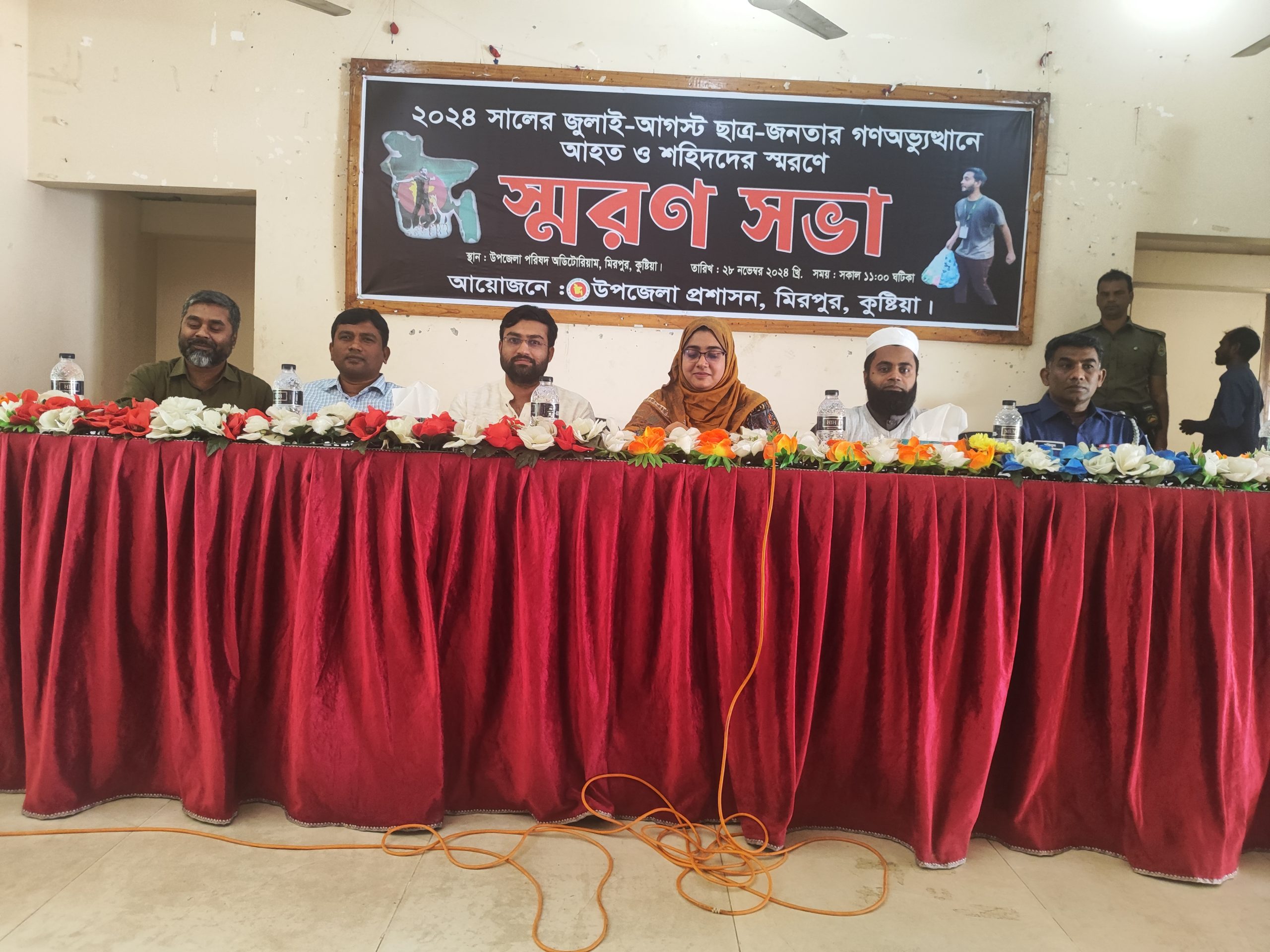কুষ্টিয়ার মিরপুরে জুলাই-আগষ্টে ছাত্র জনতার গণঅভ্যুত্থানে শহীদ ও আহতদের স্মরণে এক স্মরণ সভা অনুষ্ঠিত হয়েছে। গত বৃহস্পতিবার সকালে উপজেলা প্রশাসনের উদ্যোগে অডিটোরিয়ামে এ স্মরণ সভা অনুষ্ঠিত হয়।উপজেলা নির্বাহী কর্মকর্তা বিবি করিমুন্নেছা’র সভাপতিত্বে অনুষ্ঠানে অতিথি হিসেবে উপস্থিত ছিলেন উপজেলা সহকারী কমিশনার (ভূমি) কাজী মেশকাতুল ইসলাম, মিরপুর থানার অফিসার ইনচার্জ মমিনুল ইসলাম, উপজেলা প্রাণীসম্পদ কর্মকর্তা ডাঃ আব্দুল্লাহেল কাফী, উপজেলা যুব উন্নয়ন কর্মকর্তা বদিউজ্জামান, পল্লী বিদ্যুৎ সমিতির ডিজিএম আনন্দ কুমার কুন্ডু, উপজেলা প্রকৌশলী রৌশন আহমেদ, প্রেসক্লাবের সাবেক সভাপতি আছাদুর রহমান বাবু, অর্থ-সম্পাদক হাফিজুর রহমান । উপজেলা কৃষি কর্মকর্তা আব্দুল্লাহ আল মামুনের পরিচালনায় এ সময়ে গণঅভ্যুত্থানে আহত শফিউল ইসলাম, হৃদয় ইসলাম, লামিয়া, বৈষম্যবিরোধী শিক্ষার্থীদের মধ্যে নাইমুর রহমান সাগর, তানজিম হোসেন সাব্বির, সুলতান মাহমুদ প্রমুখ বক্তব্য রাখেন। পরে শহীদদের আত্মার মাগফিরাত ও আহতদের সুস্থতা কামনা করে বিশেষ দোয়া মোনাজাত করা হয়।