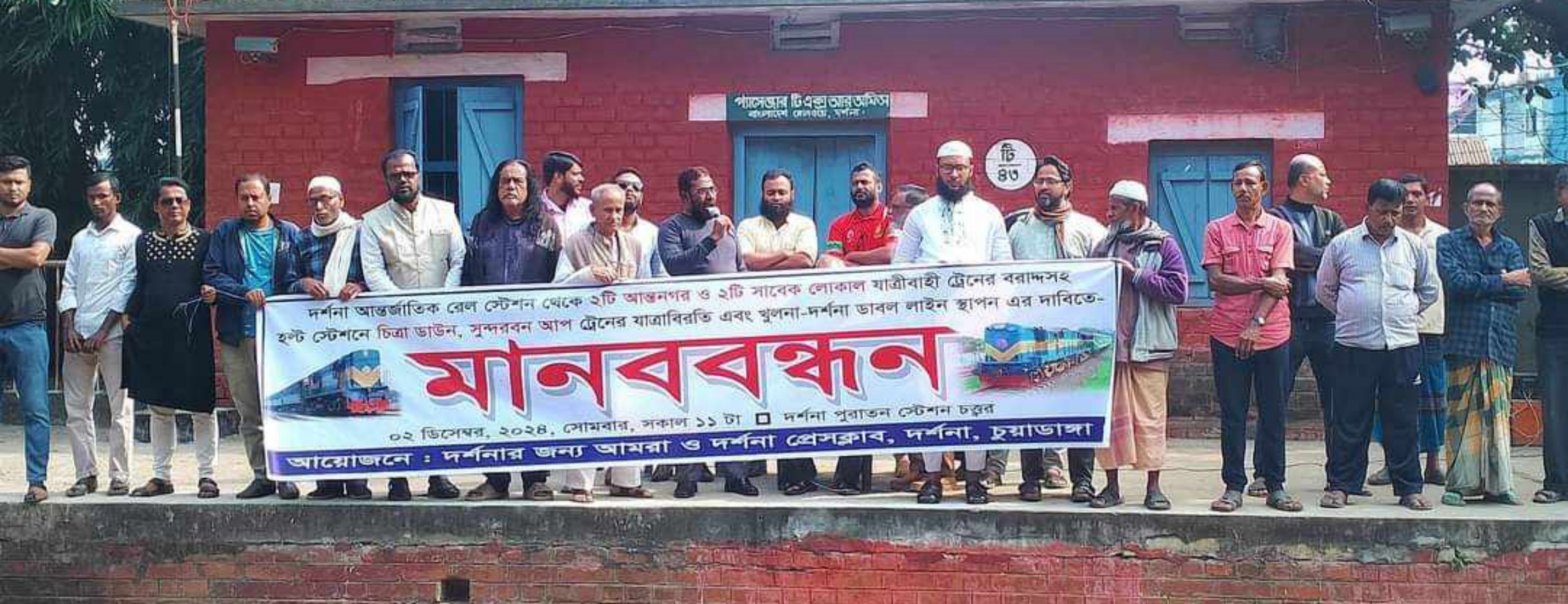 দামুড়হুদা উপজেলার দর্শনা হল্ট ষ্টেশনের চিত্রা ডাউন ও সুন্দরবন আপ ট্রেনের যাত্রাবিরতি ও দর্শনা পুরাতন আন্তজার্তিক আন্তঃ নগরসহ পূর্বের ২ টি লোকাল ট্রেনের বরাদ্দ এবং খুলনা-দর্শনা ডাবল লাইন স্হাপন সহ ৮ দফা  দাবিতে মানববন্ধন অনুষ্টিত হয়েছে।