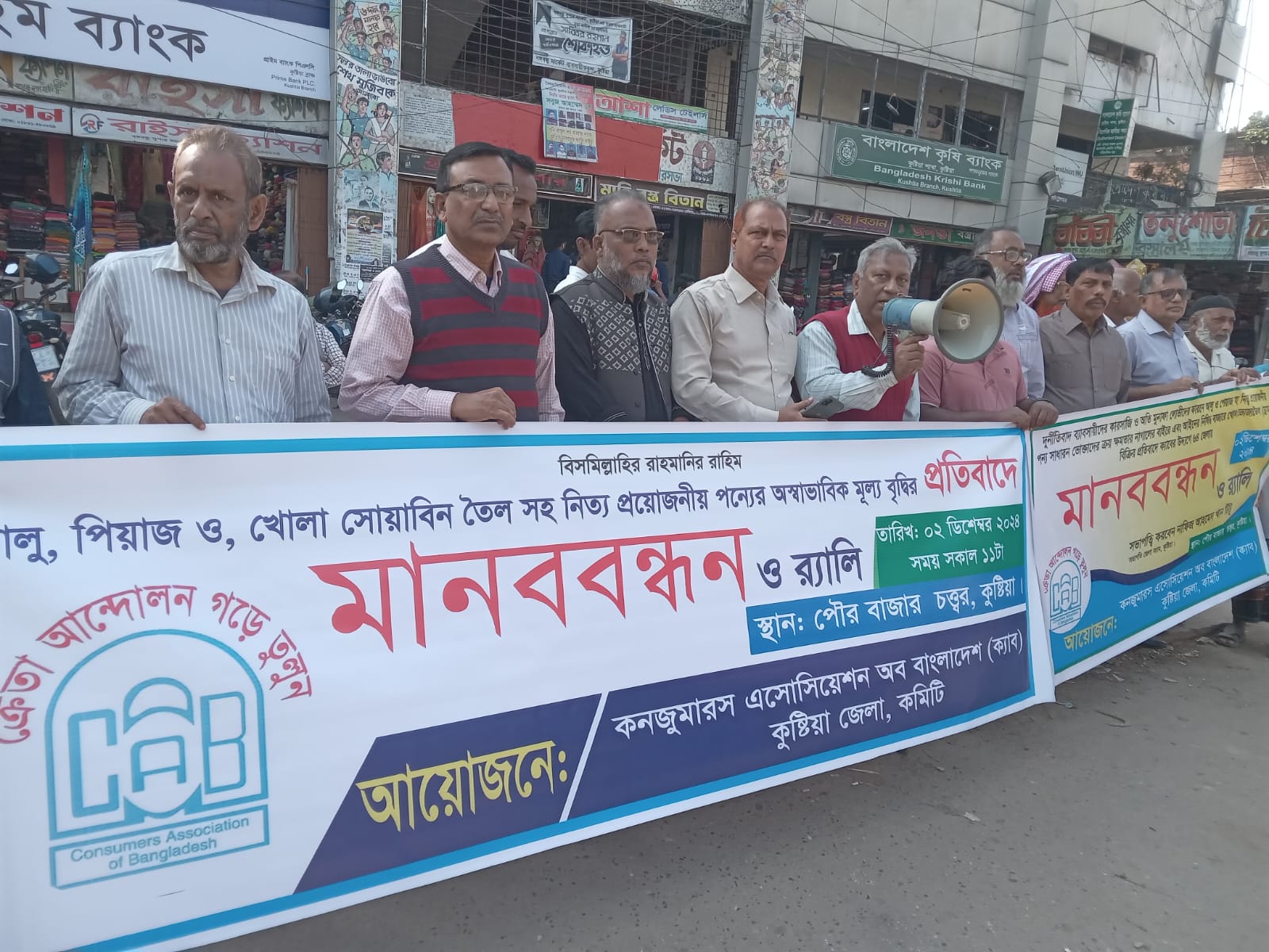 কুষ্টিয়ায় দুর্নীতিবাজ ব্যবসায়ীদের মূল্য কারসাজি ও অতিরিক্ত মুনাফার কারণে আলু-পিয়াজ সহ নিত্যপ্রয়োজনীয় পণ্যের অস্বাভাবিক মূল্য বৃদ্ধিসহ খোলা ভোজ্য তেল বিক্রির প্রতিবাদে মানববন্ধন কর্মসূচি পালন করা হয়েছে। সোমবার (২ ডিসেম্বর) সকালে কুষ্টিয়া শহরের এন এস রোড়ে কনজুমার অ্যাসোসিয়েশন অব বাংলাদেশ(ক্যাব) কুষ্টিয়া জেলার উদ্যোগে ওই মানববন্ধন কর্মসূচি পালন করা হয়।