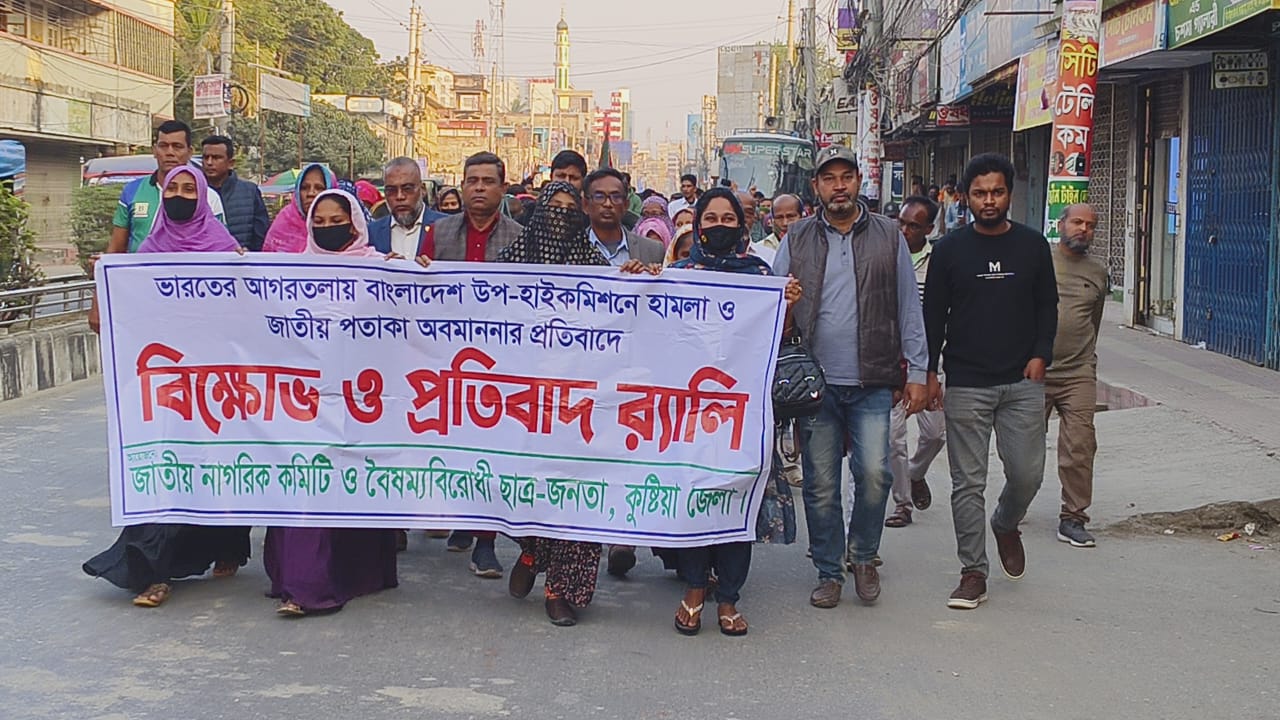 ভারতের আগরতলায় বাংলাদেশ উপ-হাইকমিশনে হামলা ও জাতীয় পতাকা অবমাননার প্রতিবাদে জাতীয় নাগরিক কমিটি ও বৈষম্য বিরোধী ছাত্র-জনতা কুষ্টিয়া জেলার বিক্ষোভ ও প্রতিবাদ র‍্যালি অনুষ্ঠিত হয়েছে।