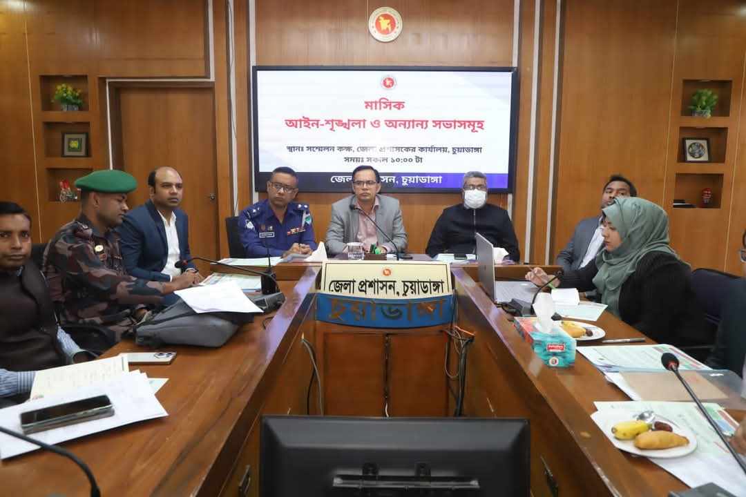 রবিবার সকাল ১০ টায় চুয়াডাঙ্গা জেলা প্রশাসকের সম্মেলন কক্ষে সভায় চুয়াডাঙ্গা জেলা প্রশাসক ও বিজ্ঞ জেলা ম্যাজিস্ট্রেট মোহাম্মদ জহিরুল ইসলাম সভাপতিত্ব করেন।বিশেষ অতিথি হিসেবে উপস্থিত ছিলেন চুয়াডাঙ্গা পুলিশ সুপার খন্দকার গোলাম মওলা, বিপিএম-সেবা।এসময় আইন-শৃঙ্খলা কমিটি, আদালত সহায়তা, সন্ত্রাস ও নাশকতা প্রতিরোধ; মানব পাচার প্রতিরোধ; চোরাচালান নিরোধ সমন্বয়; সড়ক দুর্ঘটনা হতাহতদের নির্ভুল ও সমন্বিত পরিসংখ্যান প্রণয়ন; জেলা সড়ক নিরাপত্তা কমিটি; চোরাচালান নিরোধ; অনিস্পন্ন চোরাচালান মামলাসমূহ সম্পর্কে মনিটরিং সেলের সভা অনুষ্ঠিত হয়।