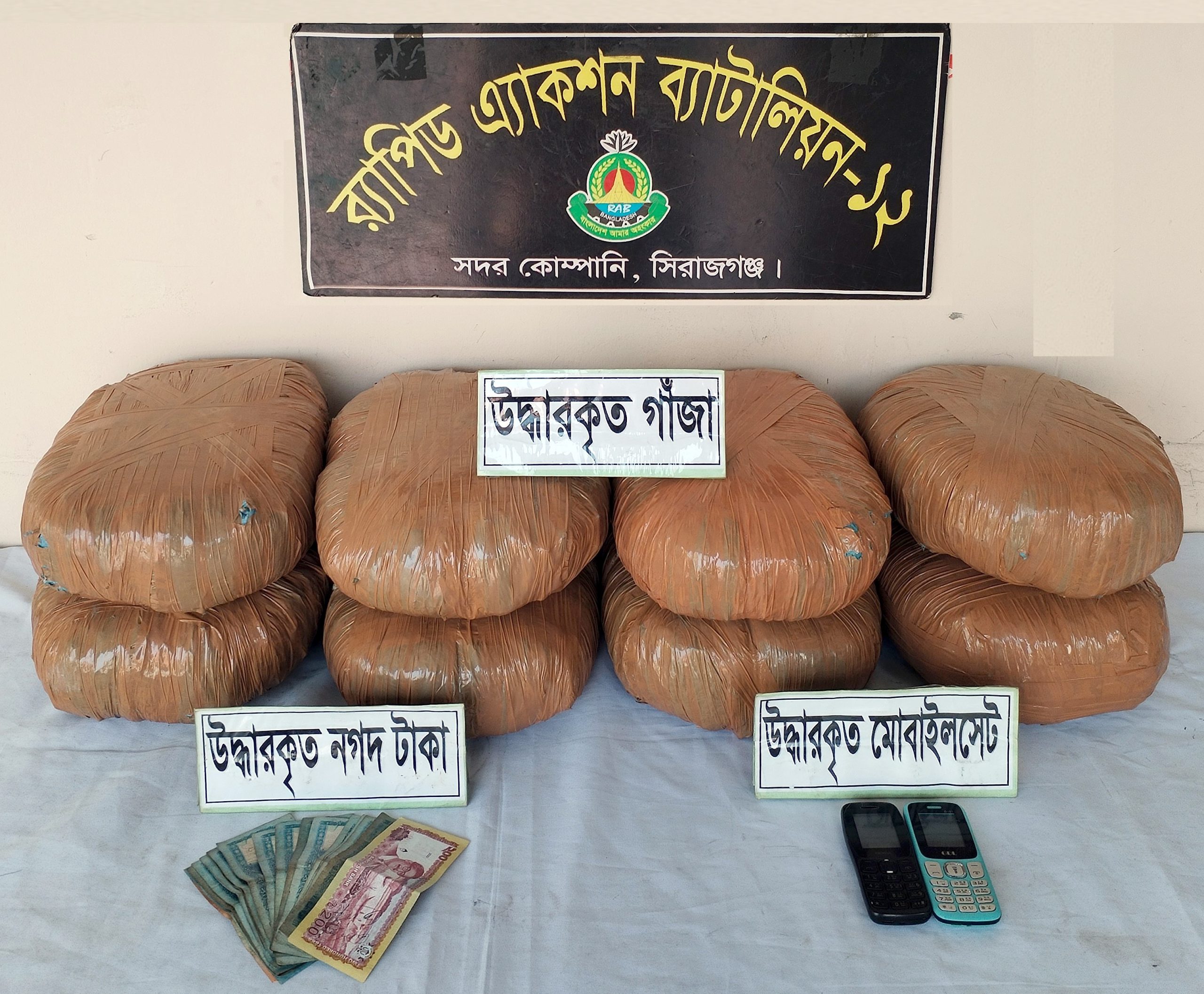 মোহাম্মদ কামরুজ্জামান পিপিএম, অধিনায়ক র‌্যাব-১২, সিরাজগঞ্জ এর দিকনির্দেশনায় এবং র‌্যাবের গোয়েন্দা শাখার সহযোগিতায় গত ১৪ ডিসেম্বর ২০২৪ খ্রি. দুপুর ১২.২০ ঘটিকায় র‌্যাব-১২, সদর কোম্পানির একটি চৌকস আভিযানিক দল “সিরাজগঞ্জ জেলার সলঙ্গা থানাধীন জাকস্ এনজিও এর সামনে রংপুর হতে ঢাকাগামী মহাসড়কের উপর” একটি মাদক বিরোধী অভিযান পরিচালনা করে। অভিনব কায়দায় (পিকআপের ড্রাইভারের ছিটের পিছনে ব্যাক ডালার নিচে) সংরক্ষিত ২০ কেজি গাঁজাসহ ০২ জন মাদক কারবারীকে গ্রেফতার করতে সক্ষম হয়। এছাড়াও তাদের সাথে থাকা মাদকদ্রব্য ক্রয়-বিক্রয় কাজে ব্যবহৃত ০২টি মোবাইল ফোন ও নগদ ১,৯৪০/- টাকা জব্দ করা হয়।