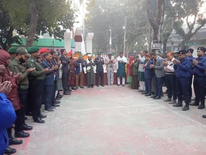 দীর্ঘ নয় মাসের সীমাহীন ত্যাগ ও অসীম বীরত্বগাঁথাই অর্জিত বাঙালির এই মহান বিজয়। বিজয়ের এই দিনে মাতৃভূমিকে পরাধীনতার শৃঙ্খলমুক্তির জন্য আত্মোৎসর্গকারী সকল বীর শহীদ, মুক্তিযোদ্ধা ও সম্ভ্রমহারা মা- বোন, যাঁদের মহান আত্মত্যাগের বিনিময়ে জন্ম হয়েছে একটি স্বাধীন সার্বভৌম বাংলাদেশ, তাঁদের গভীর শ্রদ্ধায় স্মরণ করে ফতেহা পাঠ ও দোয়া মোনাজাত করা হয়।
