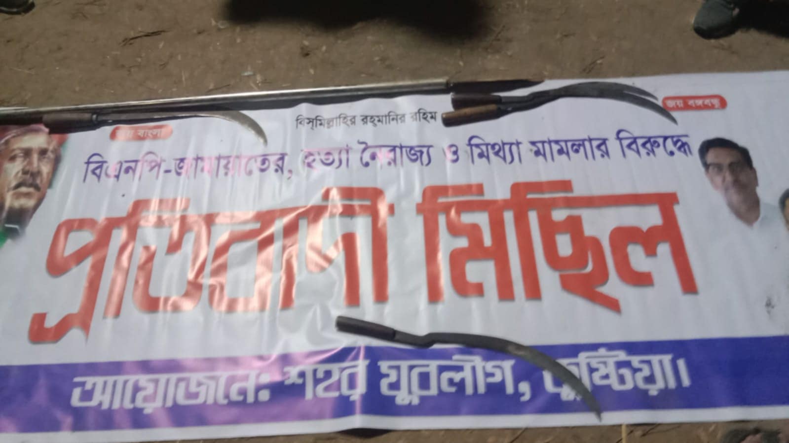 শুক্রবার (০৩ জানুয়ারি) সন্ধা সাড়ে ৬টার দিকে কুষ্টিয়া শহর যুবলীগের ব্যানারে বিএনপি-জামায়াতের, হত্যা নৈরাজ্য ও মিথ্যা মামলার বিরুদ্ধে প্রতিবাদ মিছিল করার উদ্যোগ গ্রহণ করেন। এক তথ্য সূত্রে পদবঞ্চিত কুষ্টিয়া জেলা ছাত্রদলের সাবেক সিনিয়র যুগ্ম সাধারণ সম্পাদক রাকিবুল ইসলাম রাব্বি জানতে পারেন, ফ্যাসিবাদ আওয়ামী লীগের দোসররা শহরের জগতির ফুলবাড়িয়া এলাকায় মিছিল করার প্রস্তুতি নিয়েছে। সেখানে রাব্বির নেতৃত্বে যুবদল ও ছাত্রদলের অন্যান্য নেতাকর্মী তাৎক্ষণিক ফুলবাড়ি এলাকায় পৌছালে স্বৈরাচার আওয়ামীলীগের সহযোগী সংগঠন শহর যুবলীগের সদস্যরা পালিয়ে যায়। এবিষয়ে সাবেক ছাত্র দলের নেতা রাব্বি জানান, সংবাদ পেয়ে বিষয়টি পুলিশকে অবগত করা হয়। পুলিশ উক্ত স্থানে পৌছালে কিছু দেশীয় অস্ত্র ও শহর যুবলীগের ব্যানার উদ্ধার করেন। ব্যানারে বিএনপি-জামায়াতের, হত্যা নৈরাজ্য ও মিথ্যা মামলার বিরুদ্ধে প্রতিবাদ মিছিল লেখা দেখা গিয়েছে। পদবঞ্চিত ছাত্রদলের সাবেক নেতা রাব্বি আরো জানান, আমরা ধাওয়া করলে দেখা যায়, শহর ১৭নং ওয়ার্ড যুবলীগের সাধারণ সম্পাদক পারভেজ হোসেন, নিষিদ্ধ হওয়া সংগঠন জেলা ছাত্র লীগের সহ সভাপতি সেলিম হোসেন রাজ ও আরেক যুবলীগ নেতা সজীব সহ শহর যুবলীগের ২০ থেকে ২৫জন ব্যানার ও দেশীয় অস্ত্র ফেলে পালিয়ে যায়।