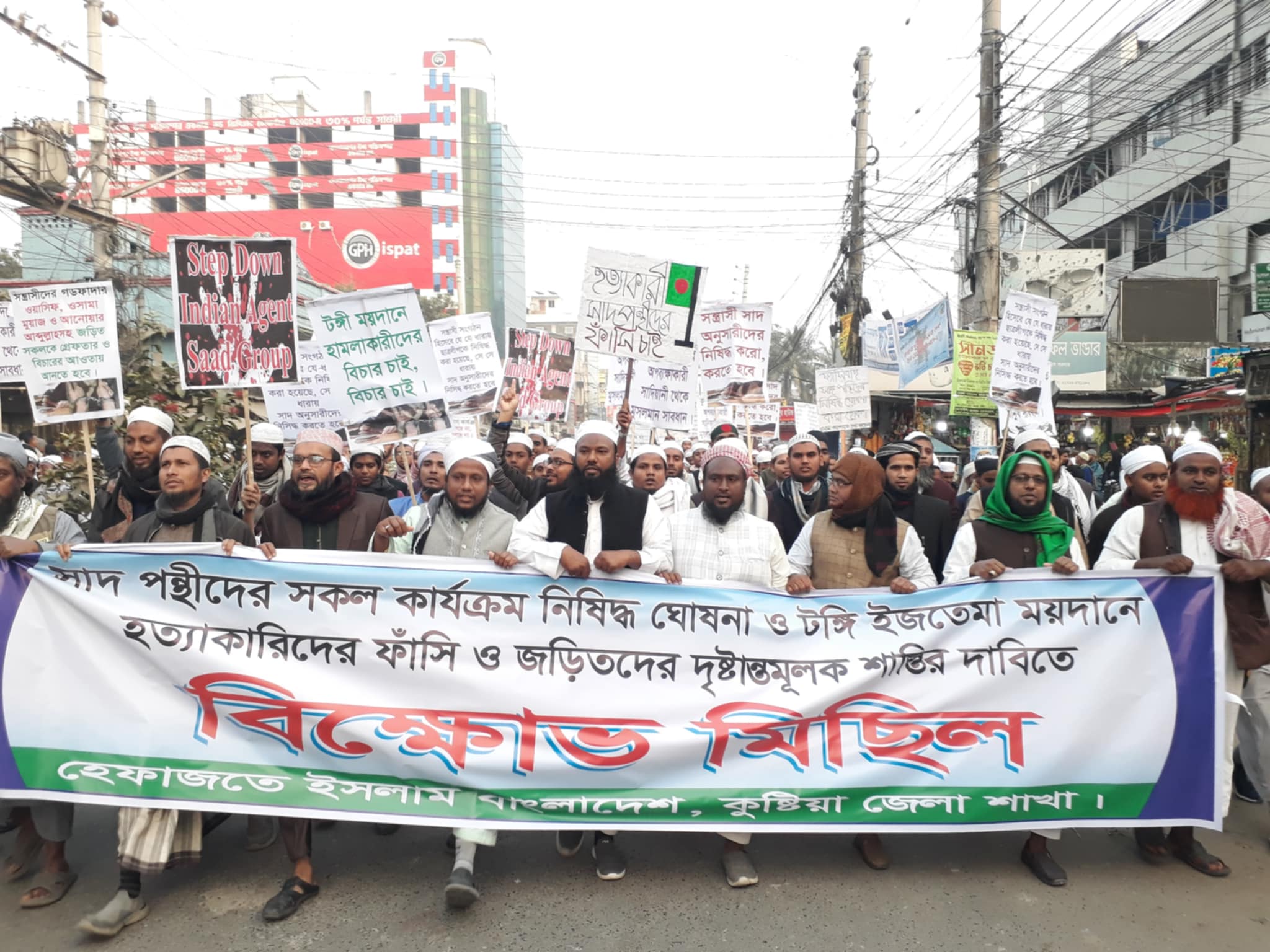 বাংলাদেশ হেফাজতে ইসলাম কুষ্টিয়া জেলা শাখা বিক্ষোভ মিছিল ও সমাবেশ করেছে। সাদ পন্থীদের সকল কার্যক্রম নিষিদ্ধ ঘোষণা ও টঙ্গী ইজতেমা ময়দানে হত্যাকারীদের ফাঁসি ও জড়িতদের দৃষ্টান্তমূলক শাস্তির দাবিতে বিক্ষোভ মিছিল অনুষ্ঠিত হয়েছে।