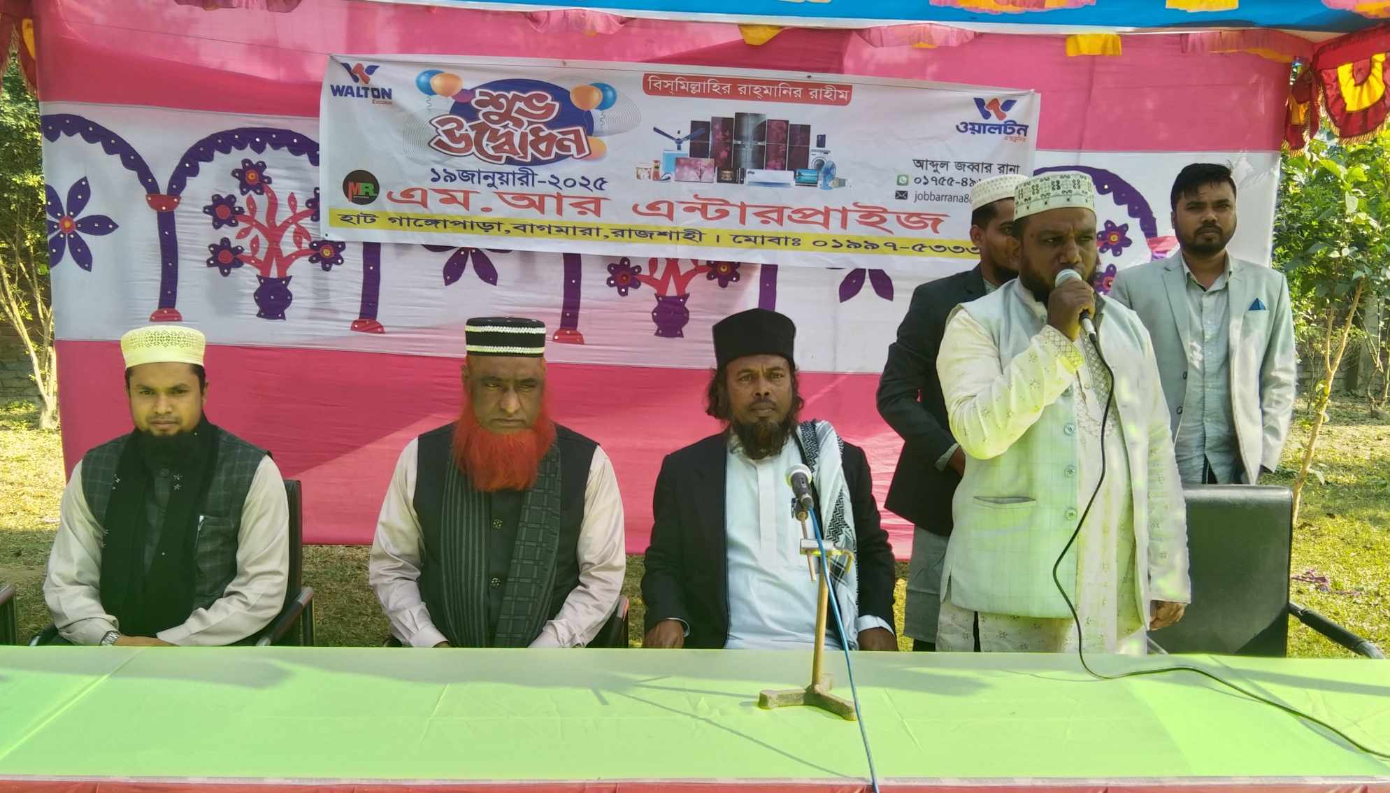 রাজশাহীর বাগমারার হাট গাঙ্গোপাড়ায় বর্ণাঢ্য আয়োজনে এম আর ওয়ালটনের এক্সক্লুসিভ শোরুম উদ্বোধন হয়েছে ।আজ রবিবার ১৯ জানুয়ারি, দুপুর আড়াই ঘটিকার সময় হাট গাঙ্গোপাড়া কারিগরি কলেজ মোড় সংলগ্ন মেইন রাস্তার পাশে এই শোরুম উদ্বোধন করা হয়। বর্ণাঢ্য আয়োজনে শোরুমটি উদ্বোধন করেন বিশিষ্ট আলেমে দ্বীন ও দেশবরেণ্য বক্তা মাওলানা মোঃ বজলুর রশিদ মিয়া।উক্ত এম আর শোরুমের প্রোপাইটর মোঃ আব্দুল জব্বার রানার এটি ২য় শোরুম। “দেশী পণ্য, কিনে হোন ধন্য” এ স্লোগানকে সামনে রেখে ওয়ালটন তার এক্সক্লুসিভ পণ্য সুনামের সাথে সারা দেশে বাজারজাত করছে। সেই ধারাবাহিকতায় ব্যবসায় প্রতিষ্ঠানটির মালিক মোঃ আব্দুল জব্বার রানা সাধারণ মানুষের দোরগোড়ায় ওয়ালটনের পণ্য ন্যায্য মূল্যে বিক্রয় এবং বিক্রয়োত্তর সেবা প্রদানের প্রতিশ্রুতি নিয়ে শোরুমটি উদ্বোধন করেন।ওয়ালটনের পণ্য সারা দেশে সাধারণত ন্যায্য মূল্যে সরবরাহ করা হয় এবং কোন কোন ক্ষেত্রে গ্রাহকদের কিস্তি সুবিধা সহ ওয়ারেন্টি এবং গ্যারান্টি সহকারে প্রায় সকল ধরনের ইলেকট্রনিক্স সামগ্রী সরবরাহ করা হয়ে থাকে।উদ্বোধনী অনুষ্ঠানটি সঞ্চালনা করেন, হাফেজ  মাওলানা মোঃ বাবুল হোসাইন। উক্ত উদ্বোধনী অনুষ্ঠানে স্বাগত বক্তব্য রাখেন এম আর শো-রুমটির স্বত্বাধিকারী মোঃ আব্দুল জব্বার রানা তিনি বলেন, আমি জনগণের দোরগোড়ায় ওয়ালটনের দেশী পণ্য পৌঁছে দেওয়ার জন্য প্রতিশ্রুতিবদ্ধ । আপনারা আমাকে সার্বিক সহযোগিতা দিলে আমি ব্যবসাটি ভালোভাবে পরিচালনা করতে সক্ষম হব। এ সময় আরো বক্তব্য রাখেন ওয়ালটনের সিনিয়র ডিস্ট্রিবিউটর অফিসার এএইচএম আসাদুজ্জামান। উক্ত উদ্বোধনী অনুষ্ঠানে উপস্থিত ছিলেন জনাব মোঃ মাহবুবুর রহমান অধ্যক্ষ, হাট গাঙ্গোপাড়া ডিগ্রী কলেজ, হাফেজ মাওলানা মোঃ আব্দুর রশিদ, মাওলানা মোঃ মাহবুবুর রহমান অধ্যক্ষ, বালানগর কামিল মাদ্রাসা। আরও উপস্থিত ছিলেন জনাব মোঃ সাইফুল ইসলাম সহকারি অধ্যাপক, বেলঘরিয়া হাট ফাজিল মাদ্রাসা, জনাব মোঃ আঃ সালাম সহকারী অধ্যাপক হাট গাঙ্গোপাড়া ডিগ্রী কলেজ, জনাব মোঃ আবু তাহের শাহ, সহকারি অধ্যাপক, হাট গাঙ্গোপাড়া ডিগ্রী কলেজ, মাওলানা মোঃ শরিফুল ইসলাম শেখ সহকারী অধ্যাপক, হাট গাঙ্গোপাড়া ডিগ্রী কলেজ, জনাব আবু আব্দুল্লাহ মোহাম্মদ আসাদ, প্রধান শিক্ষক,  হাট গাঙ্গোপাড়া কারিগরি হাই স্কুল। মাস্টার মোঃ জাফর আলী, হোসাইন মোহাম্মদ মোবারক, আলমগীর হোসেন, সাইফুল ইসলাম প্রমুখ।অনুষ্ঠানে সংক্ষিপ্ত বক্তব্যে বজলুর রশিদ মিয়া বলেন, আল্লাহ ব্যবসাকে করেছেন হালাল আর সুদকে করেছেন হারাম। তাই সৎ ব্যবসায়ী আল্লাহ তায়ালার নিকট অত্যন্ত প্রিয়। আমার বাড়ির যাবতীয় সকল ইলেকট্রনিক পণ্য ওয়ালটনের। এই পণ্যটি অত্যন্ত ভ