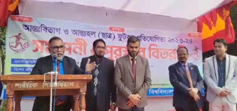 মঙ্গলবার (২১ জানুয়ারি) ১১ টায় আয়োজিত বিশ্ববিদ্যালয়ের আন্তঃবিভাগ ও আন্তঃহল ফুটবল টুর্নামেন্ট-২০২৪ এর ফাইনাল ম্যাচ শেষে পুরস্কার বিতরণী অনুষ্ঠানে এসব কথা বলে তিনি।