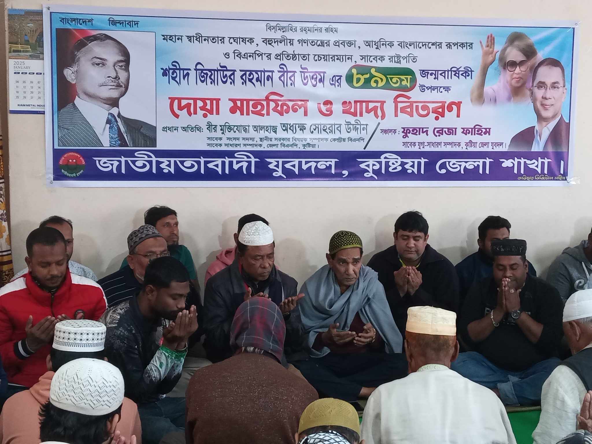 কুষ্টিয়া জেলা যুবদল এর আয়োজনে বাংলাদেশ জাতীয়বাদী দল বিএনপির প্রতিষ্ঠাতা, মহান স্বাধীনতার ঘোষক শহীদ রাষ্ট্রপতি জিয়াউর রহমান বীর উত্তম-এর ৮৯তম জন্মবার্ষিকী উপলক্ষ্যে দোয়া মাহফিল ও খাদ্য বিতরণ অনুষ্ঠিত হয়েছে।