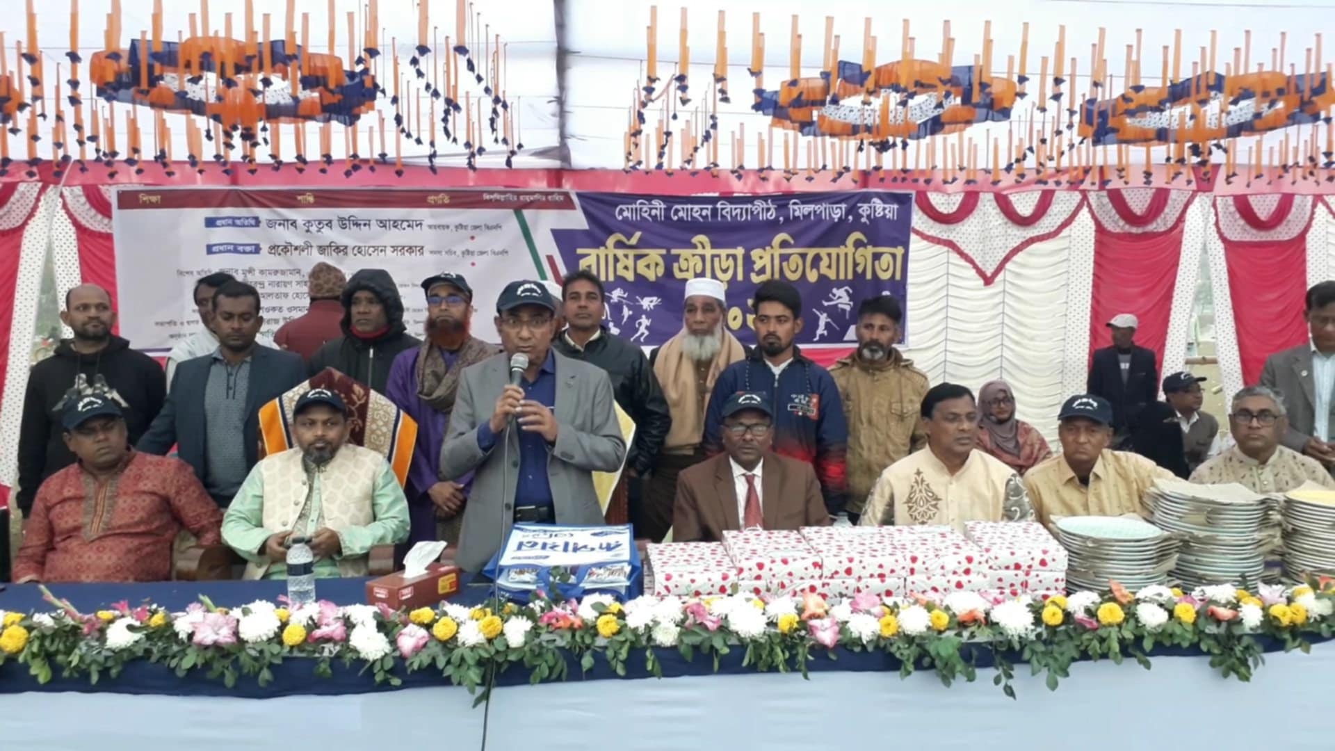 শুক্রবার (২৪ জানুয়ারি) দিনব্যাপী মিলপাড়া মোহিনী মোহন বিদ্যাপীঠের মাঠে বার্ষিক ক্রীড়া প্রতিযোগিতা অনুষ্ঠিত হয়। পরে বিকেল ৪টার দিকে পুরস্কার বিতরণী অনুষ্ঠানে প্রধান অতিথি ছিলেন জেলা বিএনপির আহবায়ক কুতুব উদ্দিন আহমেদ, প্রধান বক্তা ছিলেন জেলা বিএনপির সদস্য সচিব ও সদর উপজেলা পরিষদের সাবেক চেয়ারম্যান প্রকৌশলী জাকির হোসেন সরকার। অনুষ্ঠানে সভাপতিত্ব করেন মোহিনী মোহন বিদ্যাপীঠের প্রধান শিক্ষক সিরাজ উদ্দিন মালিথা। সঞ্চালনা করেন বিদ্যাপীঠের সহকারী প্রধান শিক্ষক আতিয়ার রহমান। এতে বিশেষ অতিথি ছিলেন, বিদ্যা পীঠের পরিচালনা পর্ষদ সভাপতি শওকত ওসমান মিষ্টি, বিদ্যা পীঠের সাবেক প্রধান শিক্ষক ও সভাপতি নীরেন্দ্র নারায়ন, কুষ্টিয়া আদর্শ ডিগ্রী মহাবিদ্যালয়ের অধ্যক্ষ আলতাফ হোসেন। এছাড়া অন্যান্যদের মধ্যে উপস্থিত ছিলেন, জজ কোর্টের পিপি সিরাজুল ইসলাম, জেলা বিএনপির সদস্য, আব্দুল মুঈদ বাবুল ও আলতাফ হোসেন, জেলা বিএনপির সাবেক সহ সম্পাদক অধ্যাপক মাহাবুব আলম বিশু প্রমূখ।