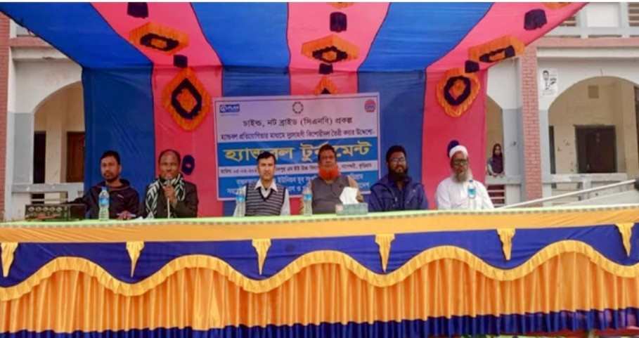 কুড়িগ্রামের নাগেশ্বরী উপজেলায় চাইল্ড, নট ব্রাইড (সিএনবি) প্রকল্প এর উদ্যোগে হ্যান্ডবল প্রতিযোগিতার মাধ্যমে দুঃসাহসী কিশোরীদল তৈরি করার লক্ষ্যে হ্যান্ডবল প্রতিযোগিতা অনুষ্ঠিত হয়েছে। বুধবার (৫ ফেব্রুয়ারী) সকাল ১১টায় উপজেলার রায়গঞ্জ ইউনিয়নের রতনপুর মহিউদ্দিন উচ্চ বিদ্যালয় মাঠে কিশোরীদের দুই দলে বিভক্ত করে হ্যান্ডবল খেলে পরিচালনা করেন। এসময় রতনপুর মহিউদ্দিন উচ্চ বিদ্যালয় এর সহকারি প্রধান শিক্ষক মোফাজ্জল হোসেনের সভাপতিত্বে প্রধান অতিথি হিসেবে উপস্থিত ছিলেন, বিদ্যালয়ের প্রধান শিক্ষক রোকমিনুজ্জামান রয়েল, আমন্ত্রিত অতিথি হিসেবে উপস্থিত ছিলেন, টেকনিকেল অফিসার ইলিয়াস হোসাইন, ফিল্ড ফ্যাসিলিডেটর রেজিনা খাতুন, অনুষ্ঠানটি পরিচালনা করেন, সহকারী শিক্ষক ওসমান গনি এবং বিদ্যালয়ের শিক্ষকরা সহ আরও অনেকেই উপস্থিত ছিলেন। হ্যান্ডবল খেলা শেষে বক্তারা কিশোর-কিশোরীদের উদ্দেশ্যে বলেন, দেশকে এগিয়ে নিয়ে যেতে তোমাদের ভূমিকা অপরিসীম। তোমরা লেখাপড়া করে দেশের উন্নয়ন করবে এটাই তোমাদের কাছে আমাদের প্রত্যাশা। বিশেষ করে কিশোরীদের মনে সাহস যোগানোর জন্য হ্যান্ডবল খেলার আয়োজন করা হয়েছে। তোমরা বাল্যবিবাহ কে প্রতিরোধ করে সমাজ এবং দেশকে উন্নত করতে সাহায্য করবে করবে। আগামী (১৩ ফেব্রুয়ারি) উক্ত মাঠেই এই প্রতিযোগিতা ফাইনাল খেলা অনুষ্ঠিত হবে।