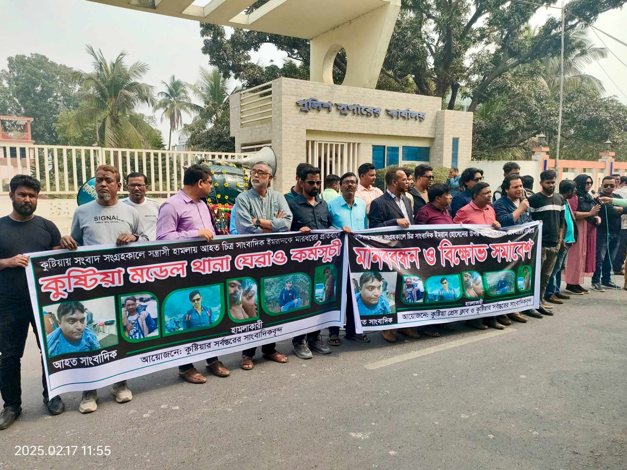সোমবার (১৭ ফেব্রুয়ারি) কুষ্টিয়া পুলিশ সুপারের কার্যালয়ের গেটের সামনে কুষ্টিয়া-মেহেরপুর সড়কে ঘণ্টাব্যাপী এ মানববন্ধন কর্মসূচির আয়োজন করে কুষ্টিয়ার সাংবাদিকবৃন্দ। তারা দোষীদের আইনের আওতায় আনতে ৪৮ ঘণ্টার আল্টিমেটাম দিয়েছেন। অন্যথায় কঠিন কর্মসূচি দেয়ার কথা জানান তারা।
