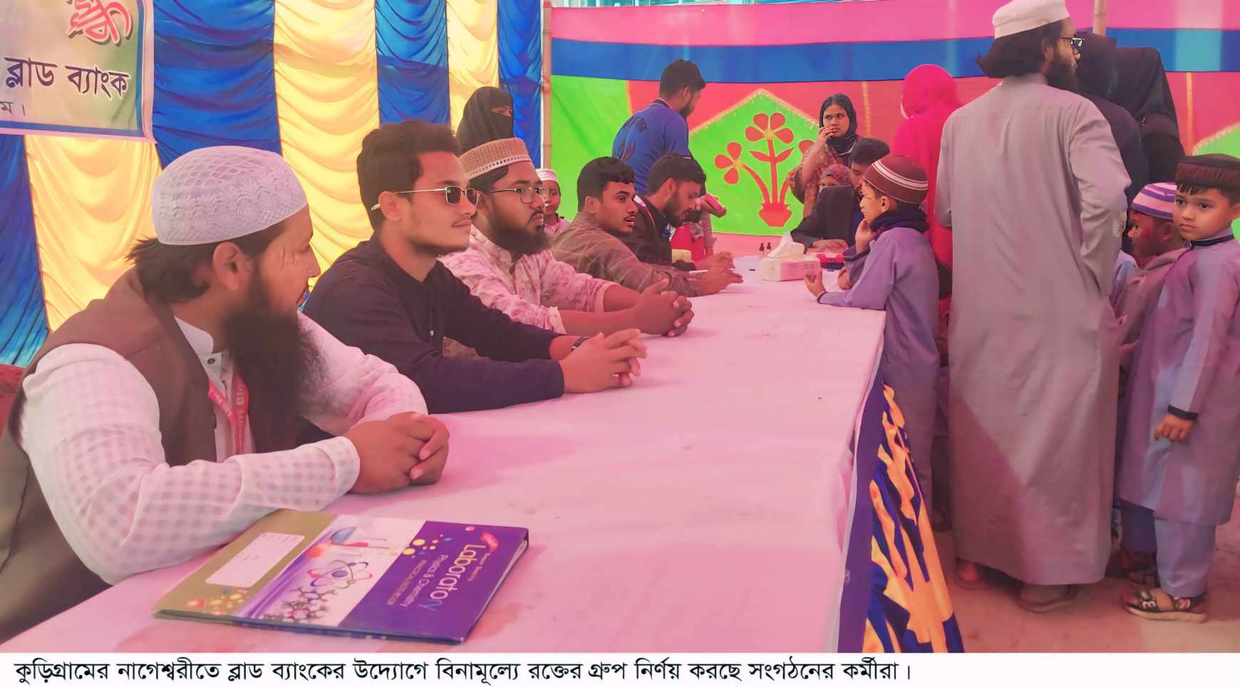 কুড়িগ্রামের নাগেশ্বরীতে বিনামূল্যে রক্তের গ্রুপ নির্ণয় কর্মসূচি অনুষ্ঠিত হয়েছে। নাগেশ্বরী বøাড ব্যাংকের আয়োজনে কলেজ মোড়স্থ আল-কাওছার মেরিট মাদরাসায় সোমবার সকাল ১০টায় এ কর্মসূচির উদ্বোধন করেন মাদরাসার পরিচালক মো. জোনায়েদ আহমেদ। দিনব্যাপী রক্তের গ্রুপ নির্ণয় কর্মসূচিতে ৩ শতাধিক মাদরাসা শিক্ষার্থীর রক্তের গ্রুপ পরীক্ষা করেন স্বেচ্ছাসেবী এই সংগঠনটি। এতে উপস্থিত ছিলেন নাগেশ্বরী ব্লাড ব্যাংকের প্রতিষ্ঠাতা ও পরিচালক রবিউল ইসলাম, সভাপতি রাশেদ আহমেদ, সহ-সভাপতি ইসমাইল হোসেন, সাধারণ সম্পাদক লিটু মিয়া, কোষাধ্যক্ষ শিহাবুল ইসলাম, মহিলা বিষয়ক সম্পাদক উম্মে কুলছুম, সহ-প্রচার সম্পাদক সোহেল রানা, শিক্ষা বিষয়ক সম্পাদক বেলাল, ধর্ম বিষয়ক সম্পাদক আরিফুল ইসলাম প্রমুখ।