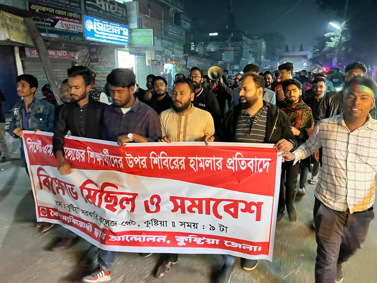 বৃহস্পতিবার (২০ ফেব্রুয়ারি) রাত সাড়ে ৯টার দিকে কুষ্টিয়া সরকারি কলেজ চত্বর থেকে বিক্ষোভ মিছিলটি শহরের পুরাতন থানা মোড়ে এসে সমাবেশের মধ্যে দিয়ে শেষ হয়। বিক্ষোভ মিছিল ও সমাবেশে দুটি সংগঠনের কয়েকশো নেতাকর্মী ও সাধারন শিক্ষার্থীরা অংশগ্রহণ করেন।