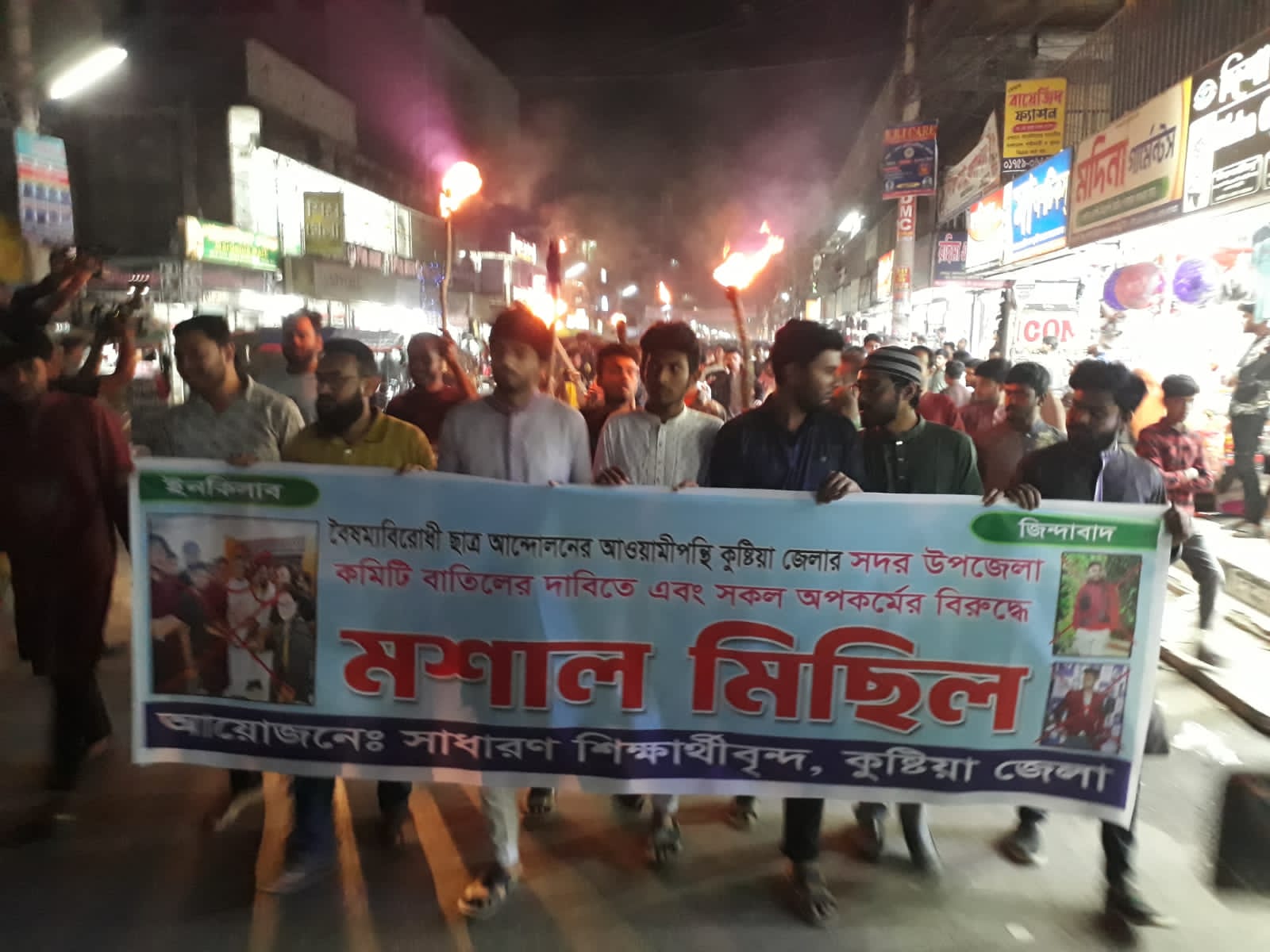 বৈষম্যবিরোধী ছাত্র আন্দোলনের আওয়ামী পন্থী কুষ্টিয়া জেলার সদর উপজেলা কমিটি বাতিলের দাবীতে এবং সকল অপকর্মের বিরুদ্ধে মশাল মিছিল করেছে সাধারন শিক্ষার্থীরা।