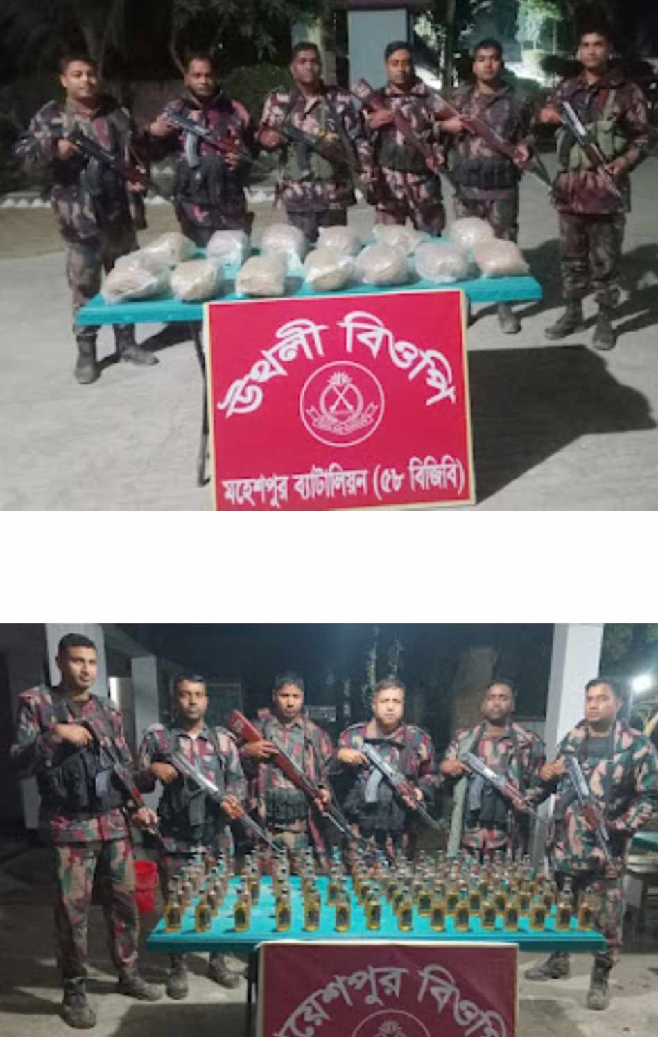 বাংলাদেশের অভ্যন্তরে গয়েশপুর উত্তর পাড়া গ্রামের আম বাগানের ভিতর হতে নাঃ সুবেঃ মোঃ আলী হোসেন এর নেতৃত্বে মাদক বিরোধী অভিযান পরিচালনা করে আসামীবিহীন১লাখ ৪৭ হাজার টাকার ৯৮ বোতল ভারতীয় মদ উদ্ধার করে।উদ্ধারকৃত মাদকদ্রব্য ধ্বংসের নিমিত্তে অত্র ব্যাটেলিয়নের মাদক স্টোরে জমা করা হয়েছে। একই দিন দুপুর আড়াইটার দিকে মহেশপুর ৫৮ ব্যাটেলিয়ান বিজিবি অধীনস্থ উথলী বিওপির দায়িত্বপূর্ণ এলাকার মেনই পিলার – ৭৩ হতে আনুমানিক ৫০০ গজ বাংলাদেশের অভ্যন্তরে সিংনগর গ্রামের মাঠের মধ্য হতে হাবিলদার মোঃ শাহানুর আলম এর নেতৃত্বে মাদকবিরোধী অভিযান পরিচালনা করে আসামিবিহীন ৪৫ হাজার ৫ শ টাকার ১৩ কেজি ভারতীয় গাঁজা উদ্ধার হয়। উদ্ধারকৃত মাদকদ্রব্য ধ্বংসের নিমিত্তে অত্র ব্যাটেলিয়নের মাদক স্টোরে জমা করা হয়।