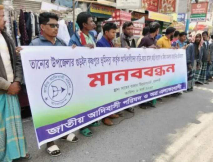 রাজশাহীর তানোর উপজেলার গুড়ইল কৃষ্ণপুর এলাকায় ক্ষুদ্র নৃগোষ্ঠীর বাড়িতে হামলা, অগ্নিসংযোগ ও মামলা দিয়ে হয়রানির প্রতিবাদে মানববন্ধন অনুষ্ঠিত হয়েছে। দুপুর ১টায় রাজশাহী নগরের সাহেববাজার জিরোপয়েন্টে জাতীয় আদিবাসী পরিষদের আয়োজনে এ কর্মসূচি পালিত হয়।
