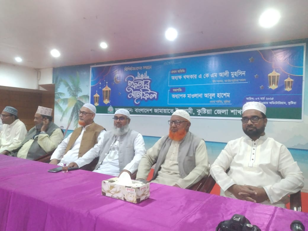 এদিকে উক্ত ইফতার ও দোয়া মাহফিলে সভাপতিত্ব করেন কুষ্টিয়া জেলা জামায়াতে ইসলামীর আমীর অধ্যাপক মাওলানা আবুল হাশেম। এতে প্রধান অতিথি ছিলেন জামায়াতে ইসলামী যশোর-কুষ্টিয়া অঞ্চলের টিম সদস্য অধ্যক্ষ খন্দকার এ কে এম আলী মুহসিন, বিশেষ অতিথি ছিলেন কুষ্টিয়া জেলা বিএনপির আহবায়ক কুতুব উদ্দিন আহমেদ, বৈষম্যবিরোধী ছাত্র আন্দোলনের সভাপতি হাসিবুর রহমান, কুষ্টিয়া জাতীয় পার্টি (কাজী জাফর) এর সাধারণ সম্পাদক আজমত আলী খান মনি ও সাংগঠনিক সম্পাদক আরিফ খান চৌধুরী সহ রাজনৈতিক নেতাকর্মী ও সুধিজনেরা।