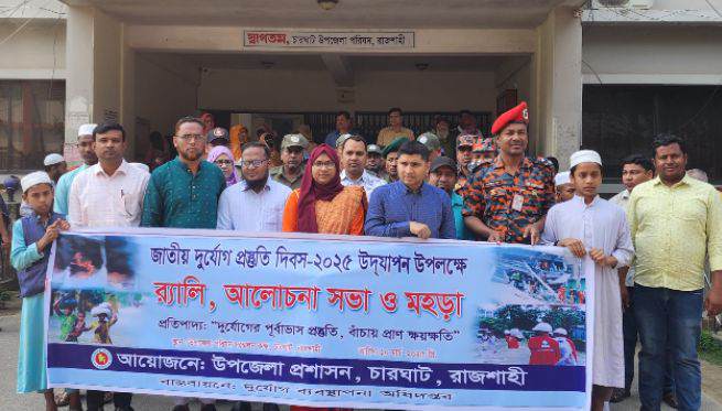 দুর্যোগ পূর্বাভাস প্রস্ততি,বাচাঁয় প্রাণ ক্ষয়ক্ষতি” এই ম্লোগানকে সামনে রেখে সারাদেশের ন্যায় রাজশাহীর চারঘাটেও জাতীয় দুর্যোগ প্রস্ততি দিবস উদযাপন উপলক্ষে ভুমিকম্প ও অগ্নিকান্ডে করণীয় বিষয়ক মহড়া, র‌্যালি ও আলোচনা সভা অনুষ্ঠিত হয়েছে।